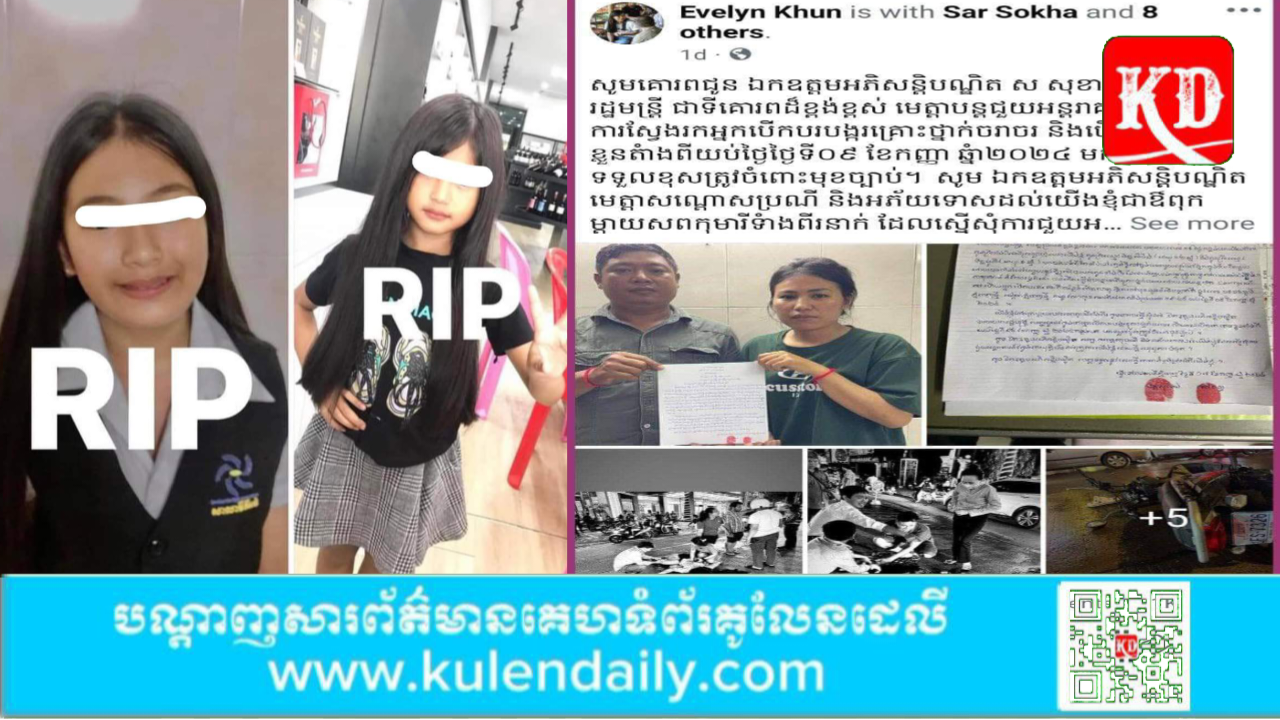 រាជធានីភ្នំពេញ ៖ លោក រ៉េន រតនៈ អ្នកនាំពាក្យឯកឧត្ដមអភិសន្តិបណ្ឌិត ស សុខា ឧបនាយករដ្ឋមន្ត្រី រដ្ឋមន្ត្រីក្រសួងមហាផ្ទៃ បានបង្ហោះសារឆ្លើយតបទៅនិងគណនីហ្វេសប៊ុកឈ្មោះ Evelyn Khun ដែលបានស្នើសុំកិច្ចអន្តរាគមន៍ ពីប្រមុខថ្នាក់ដឹកនាំក្រសួងមហាផៃ្ទ ជុំវិញករណីគ្រោះថ្នាក់ចរាចរណ៍មួយដែលបានកើតឡើង កាលពីយប់ថ្ងៃទី ៩ ខែកញ្ញា ឆ្នាំ២០២៤ បណ្តាលឱ្យកុមារី២នាក់ស្លាប់ នៅនឹងកន្លែង។