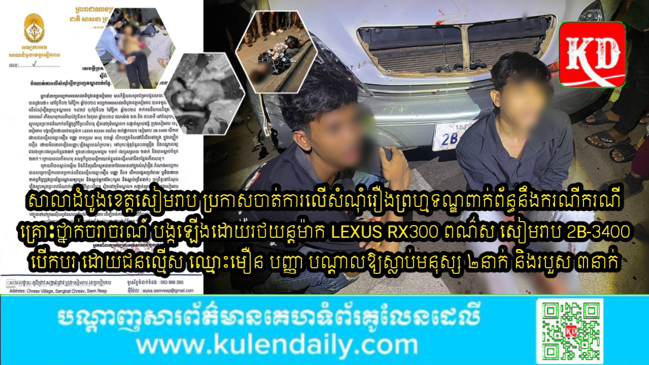 ខេត្តសៀមរាប ៖ អយ្យការអមសាលាដំបូងខេត្តសៀមរាប បានទទួលចាត់ការ លើសំណុំរឿងព្រហ្មទណ្ឌលេខ ១៤២៨ ចុះថ្ងៃទី០២ ខែវិច្ឆិកា ឆ្នាំ២០២៤ ទាក់ទងនឹងករណីគ្រោះថ្នាក់ ចរាចរណ៍ កើតហេតុកាលពីយប់ថ្ងៃទី៣១ ខែតុលា ឆ្នាំ២០២៤ វេលាម៉ោង ២៣ និង ៥០នាទី នៅចំណុចភ្លើង ស្តុបសួនព្រះរាជដំណាក់លើផ្លូវរុក្ខវិថីព្រះសីហនុ ស្ថិតនៅភូមិមណ្ឌល១ សង្កាត់ស្វាយដង្គំ ក្រុងសៀមរាប ខេត្ត សៀមរាប បង្កឡើងដោយរថយន្តម៉ាក LEXUS RX300 ពណ៌ស ពាក់ផ្លាកលេខ សៀមរាប 2B-3400 បើកបរ ដោយជនល្មើសឈ្មោះ មឿន បញ្ញា ភេទ ប្រុស អាយុ ២២ឆ្នាំ បើកបរក្នុងទិសដៅពីជើងទៅត្បូង ក្នុងល្បឿន លឿន ដោយមិនគោរពភ្លើងសញ្ញា(ភ្លើងស្តុបពណ៌ក្រហម) ទៅបុករះម៉ូតូចំនួន០៣គ្រឿង និងបណ្តាលឲ្យ ជនរងគ្រោះរងរបួសចំនួន៣នាក់ ក្នុងនោះរងរបួសមធ្យម ១នាក់ រងរបួសស្រាល ២នាក់ និងបានស្លាប់ចំនួន ២នាក់។ នេះបើយោងតាមការបញ្ជាក់របស់ អ្នកនាំពាក្យអយ្យការអមសាលាដំបូងខេត្តសៀមរាប ដែលពីភ្នាក់ងារសារព័ត៌មានគូលែនដេលី ទទួលបាននូវរសៀលថ្ងៃទី 3 ខែវិច្ឆិកាឆ្នាំ 2024 ។
