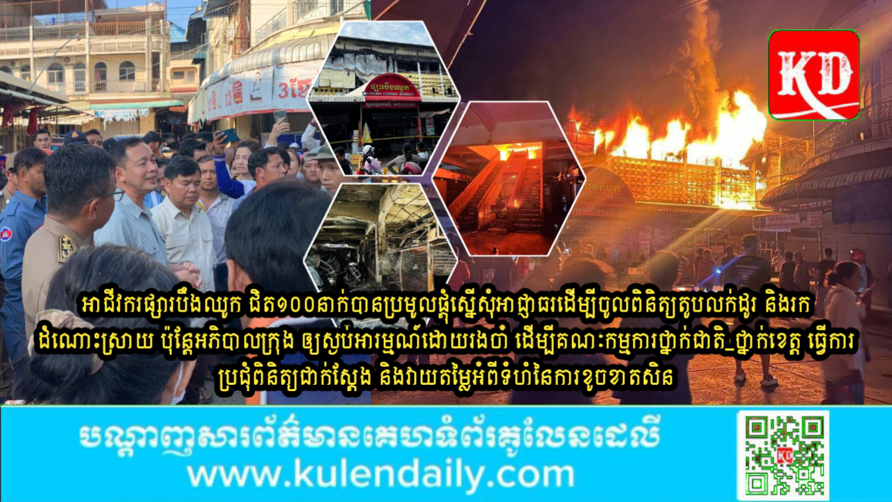 ខេត្តបាត់ដំបង ៖ នៅព្រឹកថ្ងៃទី០៥ ខែវិច្ឆិកា ឆ្នាំ២០២៤នេះ បងប្អូនអាជីវករផ្សារបឹងឈូកប្រមាណជិត១០០នាក់បានមកប្រមូលផ្តុំគ្នានៅខាងមុខផ្សារដើម្បីទាមទារស្នើសុំអាជ្ញាធរចូលក្នុងផ្សារពិនិត្យតូបលក់ដូរ និងរកដំណោះស្រាយ ក្រោយមានអគ្គិភ័យឆាបឆេះតូបខូចខាតសម្ភារអស់ជាច្រើន។