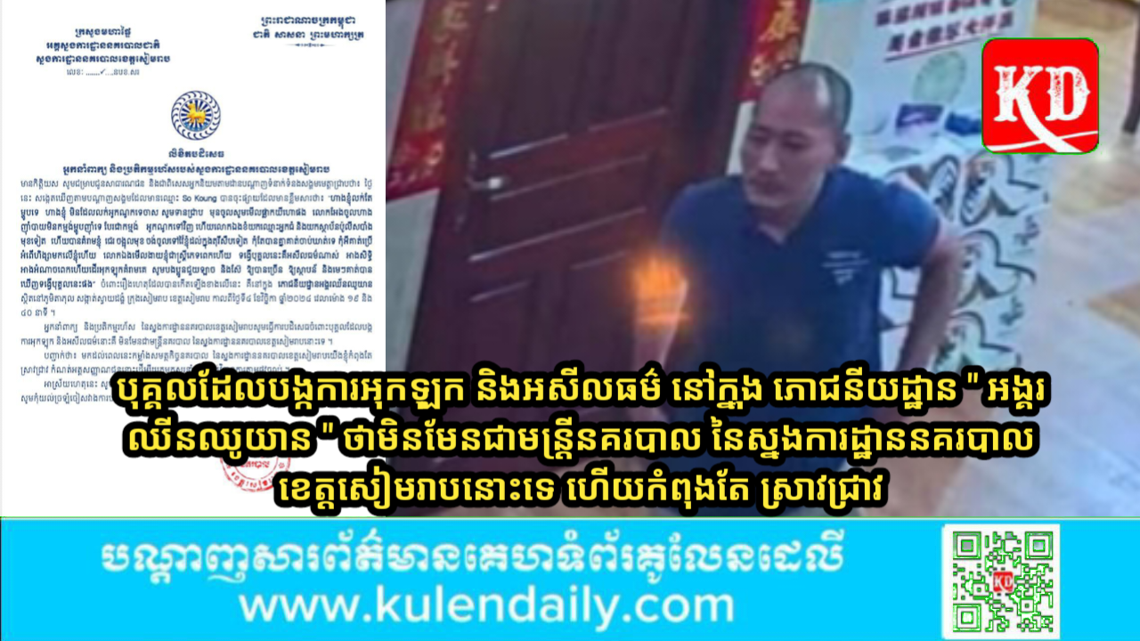 ខេត្តសៀមរាប ៖ កាលពីថ្ងៃទី៥ ខែវិច្ឆិកា ឆ្នាំ២០២៤ កន្លងទៅ ស្នងការដ្ឋាននគរបាលខេត្តសៀមរាប បានចេញលិខិតបដិសេធ ចំពោះបុគ្គលដែលបង្កការអុកឡុក និងអសីលធម៌ នៅក្នុង ភោជនីយដ្ឋាន ” អង្គរឈីនឈូយាន ” កាលពីវេលាម៉ោង ១៩ និង ៤០ នាទី ថ្ងៃទី៤ ខែវិច្ឆិកា ឆ្នាំ២០២៤ កន្លងទៅ មិនមែនជាមន្ត្រីនគរបាល នៃស្នងការដ្ឋាននគរបាលខេត្តសៀមរាបនោះទេ ពេលនេះកំពុងតែ ស្រាវជ្រាវ កំណត់អត្តសញ្ញាណជននោះហើយ។