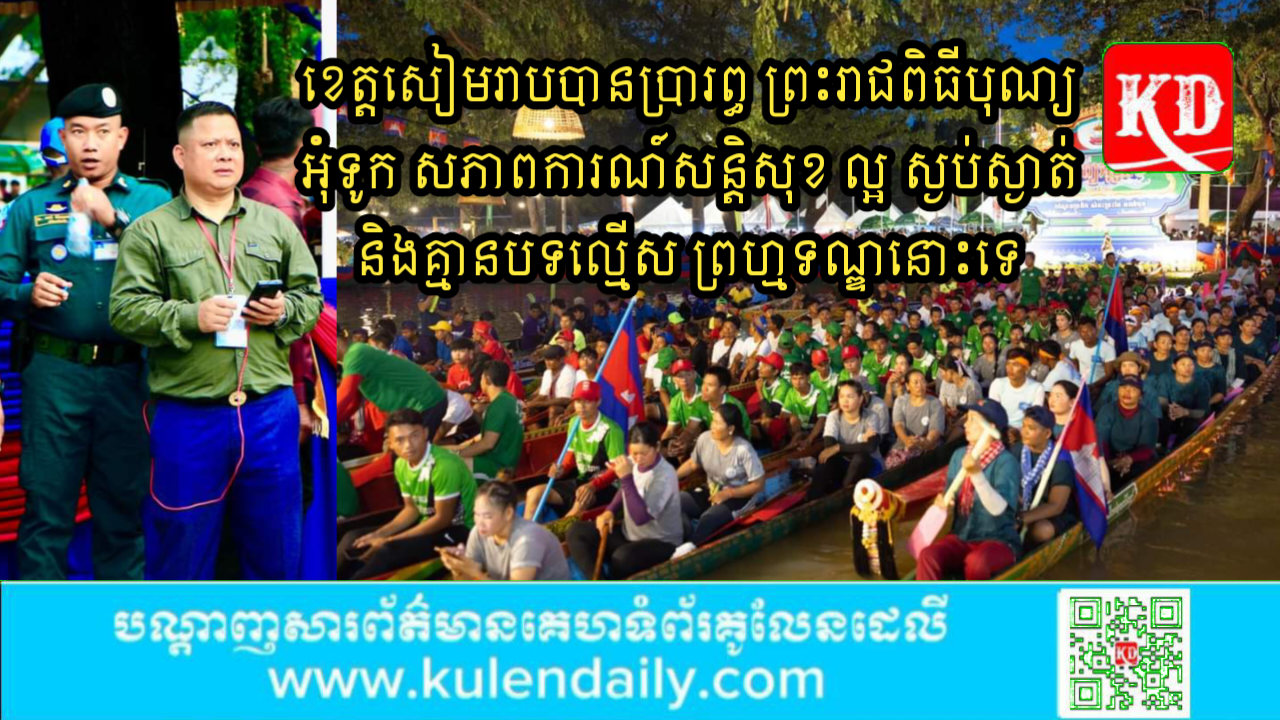 ខេត្តសៀមរាប ៖ ថ្លែងមកកាន់ទីភ្នាក់ងារ សារព័ត៌មាន គូលែនដេលី នៅរសៀលថ្ងៃទី ១៧ ខែវិច្ឆិកា ឆ្នាំ២០២៤នេះ លោកឧត្តមសេនីយ៍ទោ ហួត សុធី ស្នងការ នៃស្នងការដ្ឋាននគរបាលខេត្តសៀមរាប បញ្ជាក់ថា រយៈពេល ៤ថ្ងៃ ចាប់ពីថ្ងៃទី១៣ ដល់ ថ្ងៃទី១៦ ខែវិច្ឆិកា ឆ្នាំ២០២៤ ដែលខេត្តសៀមរាបបានប្រារព្ធ ព្រះរាជពិធីបុណ្យអុំទូក បណ្តែតប្រទីប និងសំពះព្រះខែ អកអំបុក មានប្រជាពលរដ្ឋជាតិ-អន្តរជាតិ មកចូលរួមកំសាន្ត ប្រមាណជាង ៣០ម៉ឺននាក់ គឺអាចរក្សាបាននូវសភាពការណ៍សន្ដិសុខ ល្អ ស្ងប់ស្ងាត់ និងគ្មានបទល្មើសព្រហ្មទណ្ឌនោះទេ នៅទូទាំងខេត្ត ដោយប្រើប្រាស់កងកម្លាំងទាំង៣ ដែលចំណុះឲ្យគណៈបញ្ជាការឯកភាពខេត្ត មានចំនួនជិត ៣០០០នាក់៕KD