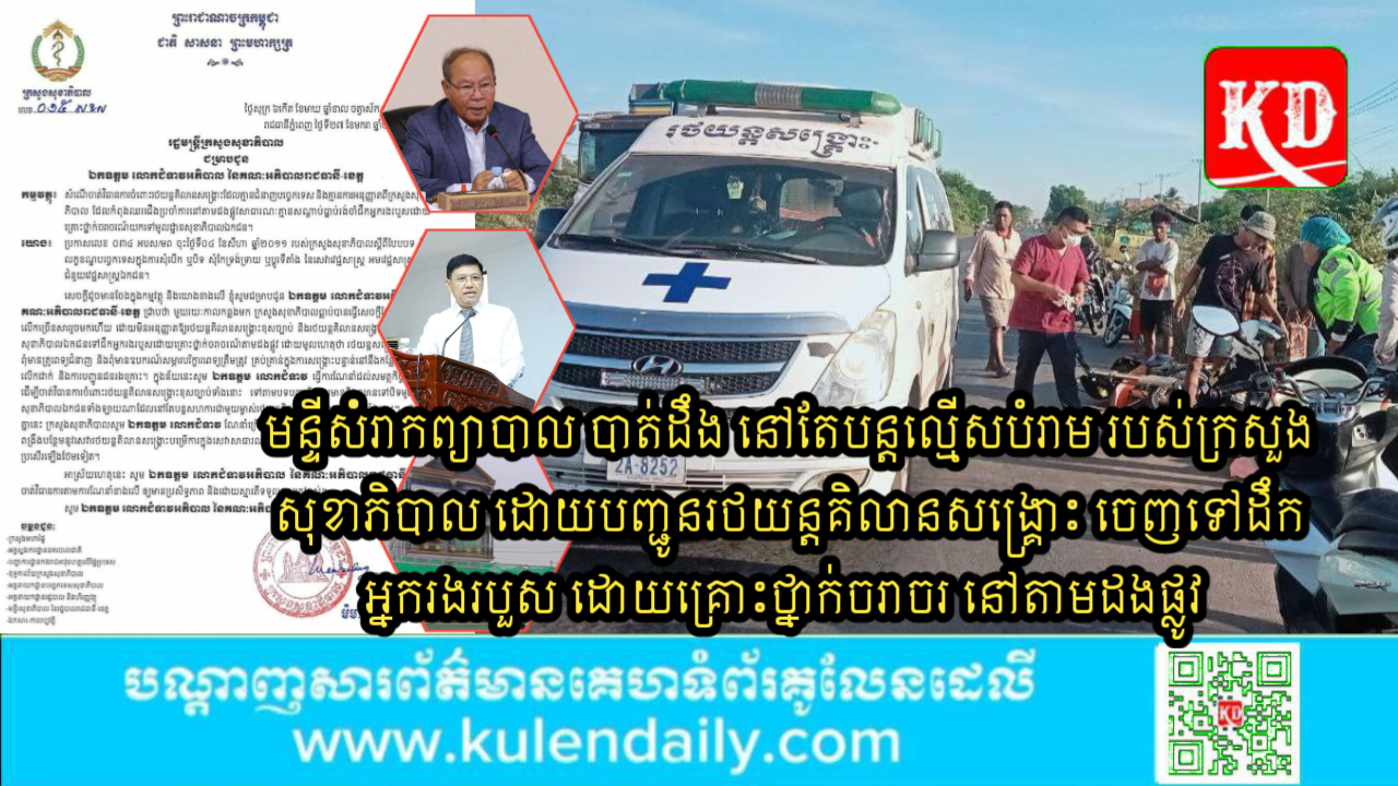 ជាការកត់សម្គាល់ កាលពីថ្ងៃទី ០៦ ខែវិច្ឆិកា ឆ្នាំ២០២៤ កន្លងទៅ នៅក្នុងប្រជុំស្ដីពីការណែនាំ និងពង្រឹងសមត្ថភាពក្នុងការផ្ដល់សេវាផ្នែកសង្គ្រោះបន្ទាន់ និងផ្នែករថយន្តគិលានសង្គ្រោះរបស់មូលដ្ឋានសុខាភិបាលឯកជននៅក្នុងរាជធានីភ្នំពេញ ឯកឧត្តមវេជ្ជបណ្ឌិត ង៉ូវ កាង រដ្ឋលេខាធិការក្រសួងសុខាភិបាល រំឭកសារជាថ្មី ដល់ម្ចាស់ពេទ្យឯកជន ហាមយករថយន្តសង្គ្រោះទៅដឹកអ្នកគ្រោះថ្នាក់ចរាចរណ៍តាមដងផ្លូវសាធារណៈ។