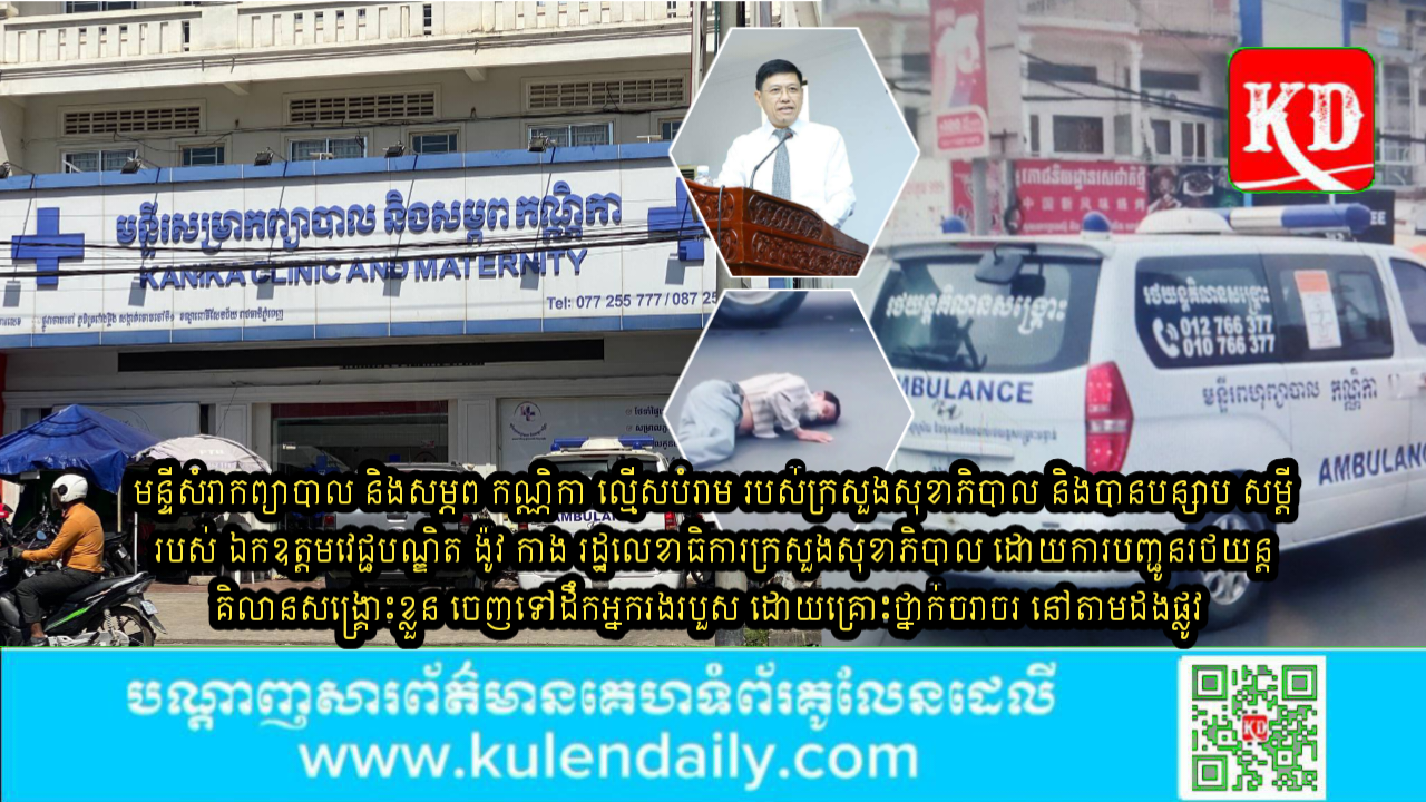 រាជធានីភ្នំពេញ ៖ មន្ទីសំរាកព្យាបាល និងសម្ភព កណ្ណិកា ដែលមានអាស្រ័យដ្ឋាននៅតាមបណ្តោយផ្លូវ ចោមចៅ ស្ថិតក្នុងភូមិត្រពាំងថ្លឹង សង្កាត់ចោមចៅទី១ ខណ្ឌពោធិ៍សែនជ័យ រាជធានីភ្នំពេញ បានបញ្ជូនរថយន្តគិលានសង្គ្រោះ របស់ខ្លួន ឲ្យចេញយកអ្នករងរបួស ដោយគ្រោះថ្នាក់ចរាចរ ក្នុងករណី ម៉ូតូ នឹងរថយន្ត បណ្តាលអោយបុរសម្នាក់រងរបួសធ្ងន់ នៅផ្លូវវែងស្រេង ត្រង់ចំណុចមុខរោងចក្រ ៦ជាន់ ស្ថិតក្នុងភូមិសាស្ត្រសង្កាត់ចោមចៅទី ២ ខណ្ឌពោធិ៍សែនជ័យរាជធានីភ្នំពេញ កាលពីវេលាម៉ោង ១០ និង ៤៤នាទី ថ្ងៃទី ២៦ ខែវិច្ឆិកា ឆ្នាំ២០២៤ ដែលទង្វើនេះ បានល្មើសបំរាម របស់ក្រសួងសុខាភិបាល យ៉ាងធ្ងន់ធ្ងរ ដែលបានហាមមិនឲ្យរថយន្តគិលានសង្គ្រោះ ឯកជនទូទាំងរាជធានី-ខេត្តទាំងអស់ ចេញទៅដឹកអ្នករងរបួស ដោយគ្រោះថ្នាក់ចរាចរ នៅតាមដងផ្លូវនោះឡើយ និងជាពិសេសបានបន្សាប សម្ដីរបស់ ឯកឧត្តមវេជ្ជបណ្ឌិត ង៉ូវ កាង រដ្ឋលេខាធិការក្រសួងសុខាភិបាល ដែលបានរំឭកសារជាថ្មី ដល់ម្ចាស់ពេទ្យឯកជន ហាមយករថយន្តសង្គ្រោះទៅដឹកអ្នកគ្រោះថ្នាក់ចរាចរណ៍តាមដងផ្លូវសាធារណៈនាពេលថ្មីៗកន្លងទៅនេះ។