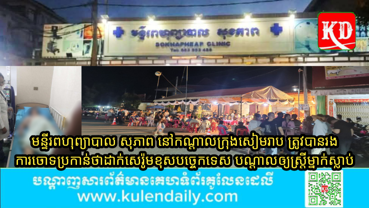 ខេត្តសៀមរាប ៖ នៅរសៀលថ្ងៃទី៩ ខែធ្នូ ឆ្នាំ២០២៤ មានហេតុការណ៍ភ្ញាក់ផ្អើលមួយពេញក្រុងសៀមរាបថា មន្ទីរពហុព្យាបាល សុខភាព ដែលមានទីតាំងស្ថិតតាមបណ្ដោយផ្លូវជាតិលេខ៦ ត្រង់ចំណុចខាងកើតសណ្ឋាគារ អង្គរប៉ារ៉ាឌី នៅក្នុងភូមិតាភុល សង្កាត់ស្វាយដង្គំ ក្រុងសៀមរាប ខេត្តសៀមរាប បានដាក់សេរ៉ូម ខុសបច្ចេកទេស បណ្ដាលឲ្យស្ត្រីវ័យ ៤៦ឆ្នាំម្នាក់ មានឈ្មោះ ជុំ រាម មុខរបរ កសិករ ស្ថិតនៅផ្សារព្រះដាក់ ក្នុងភូមិព្រះដាក់ ស្រុកបន្ទាយស្រី ខេត្តសៀមរាប ស្លាប់បាត់បង់ជីវិត។