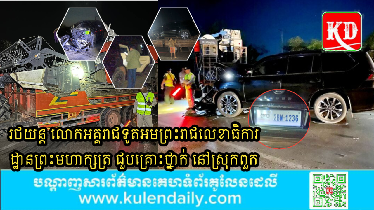 ខេត្តសៀមរាប ៖ មានករណីគ្រោះថ្នាក់ចរាចរណ៍ កើតឡើង កាលពីវេលាម៉ោង ២២ និង៣០នាទីថ្ងៃទី១៧ ខែធ្នូ ឆ្នាំ២០២៤ លើផ្លូវជាតិលេខ៦ ត្រង់ចន្លោះបង្គោលគីឡូម៉ែត្រលេខ ៣៤៨-៣៤៩ ស្ថិតក្នុងភូមិព្រៃជ្រូក ឃុំព្រៃជ្រូក ស្រុកពួក ខេត្តសៀមរាប រវាងរថយន្តម៉ាក Lexus LX 570 Kuro ពណ៍ខ្មៅ ផ្លាកលេខ ភ្នំពេញ 2BW-1236 ជាមួយត្រាក់ទ័រ ម៉ាកគូបូតា ពណ៌ក្រហម សណ្តោង រ៉ឺម៉កពណ៌ក្រហម គ្មានផ្លាកលេខ មានដឹកដឹកម៉ាសុីនច្រូតស្រូវ។
