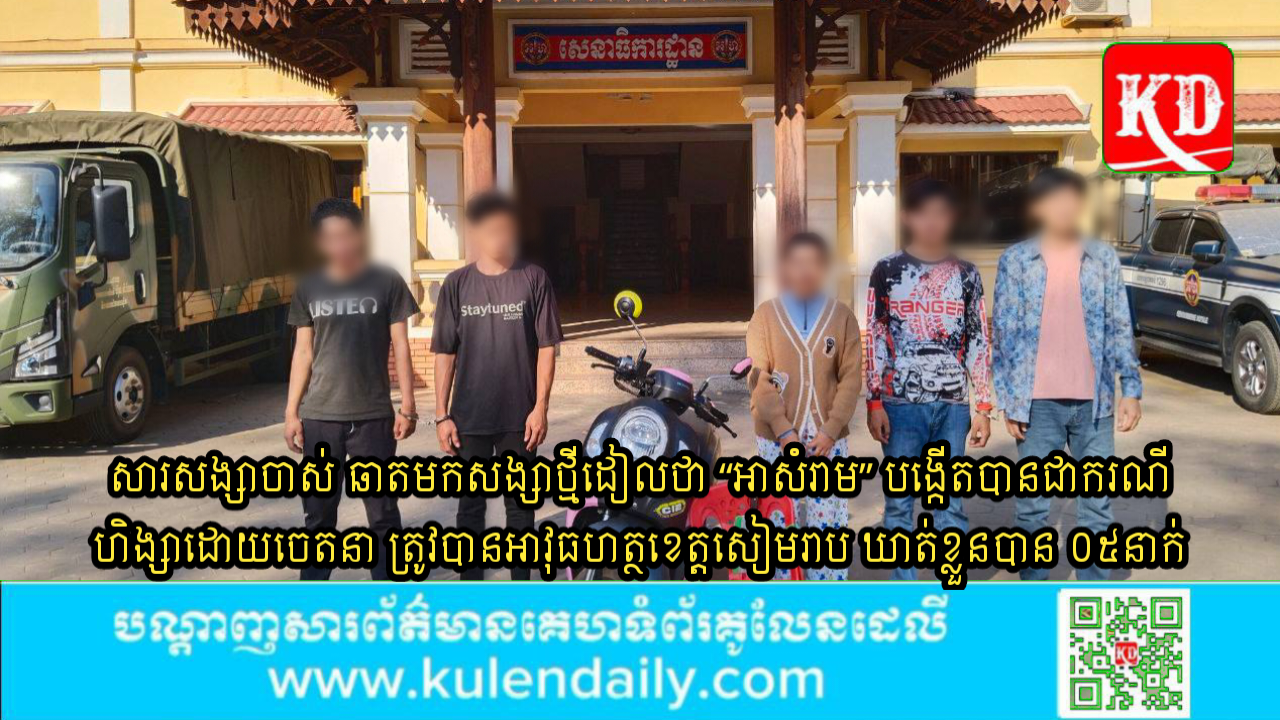 ខេត្តសៀមរាប ៖ នៅវេលាម៉ោង ០២ និង ០០នាទីរំលងអធ្រាត្រ ឈានចូល ថ្ងៃទី១៥ ខែមករា ឆ្នាំ២០២៥ កម្លាំងកងរាជអាវុធហត្ថខេត្តសៀមរាប ល្បាតនៅចំណុច មុខសណ្ឋាគារតាព្រហ្ម ស្ថិតនៅភូមិមណ្ឌល២ សង្កាត់ស្វាយដង្គំ ក្រុងសៀមរាប ខេត្តសៀមរាប ឃើញមនុស្សចំនួន ០២ក្រុម មានគ្នាប្រហែល ១០នាក់ ប្រដាប់ដោយកៅអីជ័រ និងកាំបិតតាំងតោ បានធ្វើសកម្មភាពវាយគ្នា ប៉ុន្តែមិនមានអ្នកណារបួលស្នាមអ្វីឡើយ កម្លាំងក៍ធ្វើការឃាត់ខ្លួនបានមនុស្សចំនួន ០៥នាក់ ស្រី ០១នាក់ យកទៅសួរ នាំនៅកងរាជអាវុធហត្ថខេត្តសៀមរាប ។