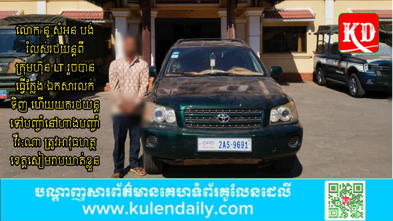 ខេត្តសៀមរាប ៖ អាវុធហត្ថខេត្តសៀមរាប ឃាត់ខ្លួនជនសង្ស័យម្នាក់ និងកសាងសុំណុំរឿងបញ្ជូនទៅតុលាការ ពាក់ព័ន្ធករណី រំលោភលើទំនុកចិត្ត និងក្លែងបន្លំឯកសាសារធារណៈ និងប្រើប្រាសឯកសារសាធារណៈក្លែង ដោយបានបង់រំលស់រថយន្តពីក្រុមហ៊ុន LT រួចបានធ្វើក្លែង ឯកសារលក់ទិញ ហើយបានយករថយន្ដទៅបញ្ចាំនៅហាងបញ្ចាំ វីរ:ណា ។