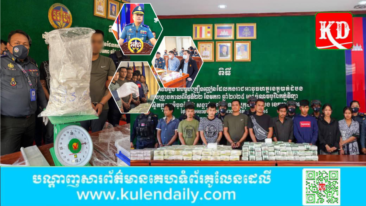 ខេត្តបាត់ដំបង ៖ តាមបទបញ្ជាដ៏ខ្ពង់ខ្ពស់ របស់លោក ឧត្តមសេនីយ៍ត្រី ហែម វុទ្ធី មេបញ្ជាការកងរាជអាវុធហត្ថខេត្តបាត់ដំបងកម្លាំងកងអាវុធហត្ថខេត្តបាត់ដំបង បានធ្វើការចាប់ខ្លួនមេក្លោង និងបក្ខពួកជាង១០នាក់ ជាមួយនឹង គ្រឿងញឿនជាង ២០០គីឡូក្រាមនៅខេត្តភាគខាងលិចប្រទេសកម្ពុជា នៅរយះពេលពីរថ្ងៃជាប់គ្នាក្នុងសប្ដាហ៍ទី៣ នៃខែមករា ឆ្នាំ២០២៥នេះ។