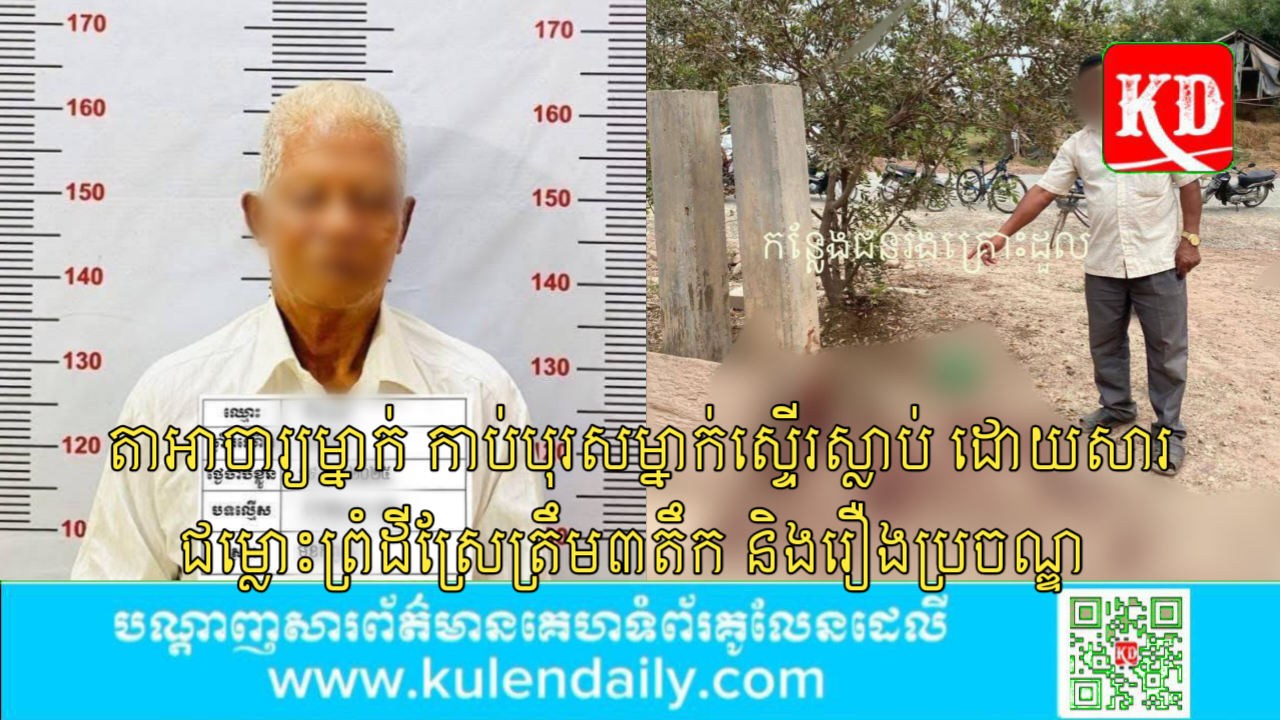 ខេត្តកណ្តាល ៖ ព្រោះតែជម្លោះព្រំដីស្រែ និងភ្លើងប្រចណ្ឌ នាំឲ្យលោកតាអាចារ្យម្នាក់ ចងគំនុំហើយឈានទៅដល់ការលបកាប់ប្រហារជនរងគ្រោះរបួសធ្ងន់សង្រ្គោះបន្ទាន់នៅមន្ទីរពេទ្យកាល់ម៉ែត កាលពីវេលាម៉ោង ១២៖៣០នាទី ថ្ងៃទី១៩ ខែកុម្ភៈ ឆ្នាំ២០២៥ ពេលដែលជនរងគ្រោះកំពុងដេកនៅលើអង្រឹងក្រោមផ្ទះ ក្នុងភូមិស្វាយអំពារ ឃុំស្វាយអំពារ ស្រុកមុខកំពូល ខេត្តកណ្ដាល។
