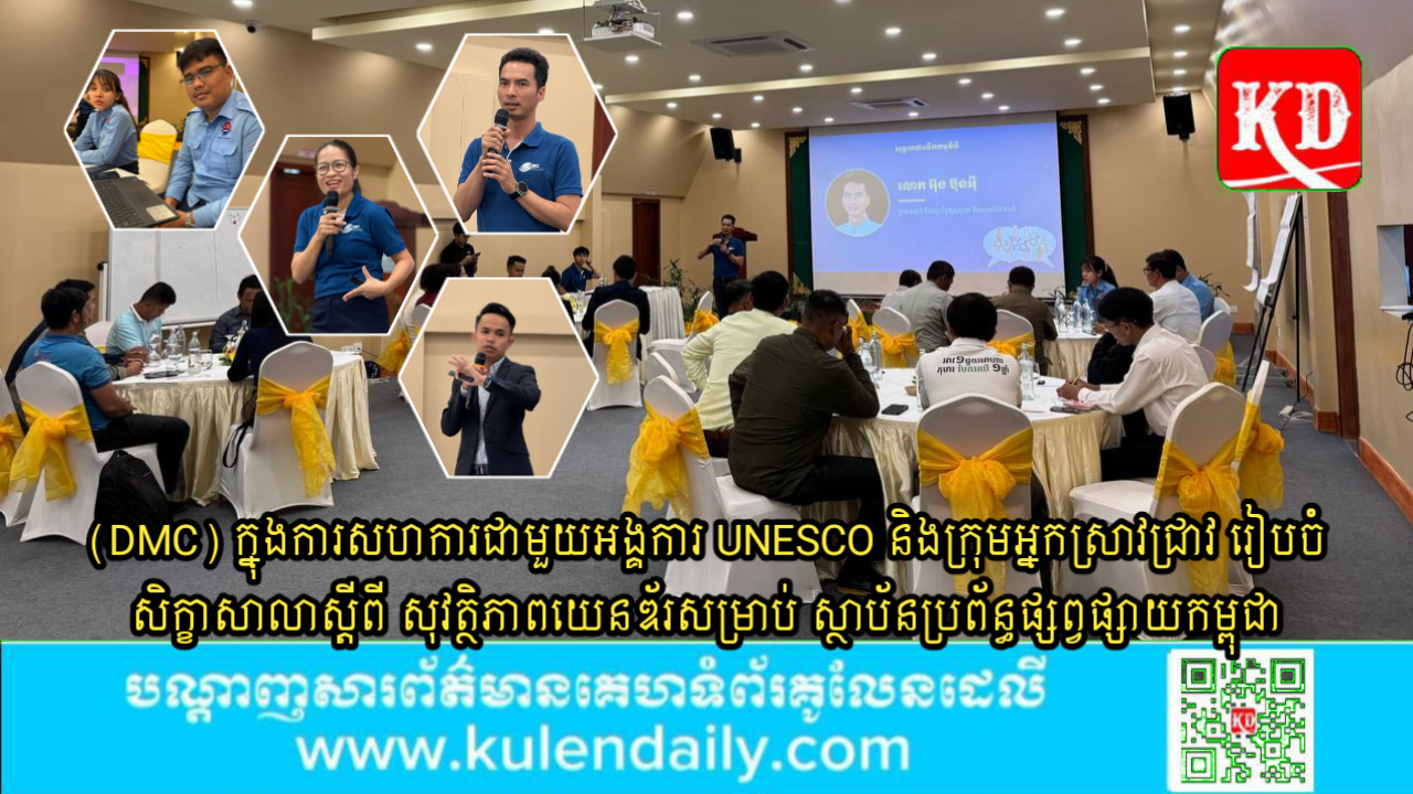 ខេត្តសៀមរាប ៖ ដេប៉ាតឺម៉ង់ប្រព័ន្ធផ្សព្វផ្សាយ និងសារគមនាគមន៍ Dieguement and Communication (DMC) ដែលមកពីសកលវិទ្យាល័យភូមិន្ទភ្នំពេញ មានលោក-លោកស្រី វាគ្មិន និងសហការចំនួន ១០នាក់ បានរៀបចំ សិក្ខាសាលាលើកកម្ពស់ការយល់ដឹងគោលការណ៍ណែនាំសុវត្ថិភាពយេនឌ័រសម្រាប់ស្ថាប័នប្រព័ន្ធផ្សព្វផ្សាយកម្ពុជា ដោយមានការអញ្ជើញចូលដោយលោក-លោកស្រី មកពីមន្ទីរព័ត៌មានខេត្ត និងលោក-លោកស្រី មកពីអង្គភាពសារព័ត៌មាន ចំនួន ២៥រូប ក្នុងសាលប្រជុំនៃ សណ្ឋាគារ Landing Gold by Amatak សៀមរាប នារសៀលថ្ងៃទី២១ ខែកុម្ភៈ ឆ្នាំ២០២៥។