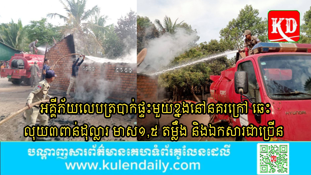 ខេត្តសៀមរាប ៖ យោងតាមប្រភពបានឲ្យដឹងថា នៅព្រឹកថ្ងៃទី២៧ ខែកុម្ភៈ ឆ្នាំ២០២៥ វេលាម៉ោង០៨ និង ០០នាទី មានករណីភ្លើងឆេះផ្ទះប្រជាពលរដ្ឋអស់ចំនួន ០១ខ្នង ផ្ទះជញ្ជាំងកឥដ្ឋ គ្រោងឈើប្រក់សង្ក័សី ស្ថិតនៅភូមិនគរក្រៅ សង្កាត់គោគចក ក្រុងសៀមរាប ខេត្តសៀមរាប។