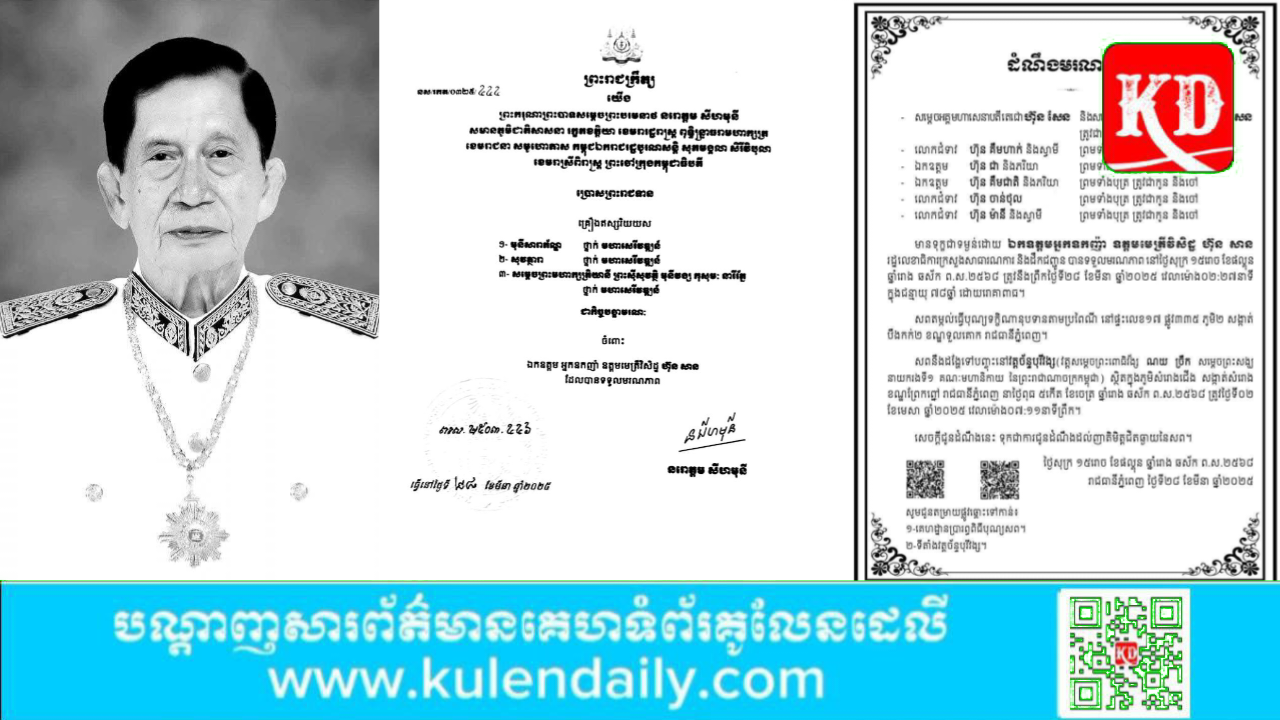 រាជធានីភ្នំពេញ ៖ នៅថ្ងៃទី២៨ ខែមិនា ឆ្នាំ២០២៥ នេះ ព្រះករុណា ព្រះមហាក្សត្រ ចេញព្រះរាជក្រឹត្យ ប្រោសប្រទានគ្រឿងឥស្សរិយយសចំនួន ៣ ចំពោះ ឯកឧត្តមអ្នកឧកញ៉ា ឧត្តមមេត្រីវិសិដ្ឋ ហ៊ុន សាន ជាកិច្ចបច្ចាមរណៈ ក្រោយពីអ្នកឧកញ៉ាបានទទួលមរណភាព នៅថ្ងៃសុក្រ ១៥រោច ខែផល្គុន ឆ្នាំរោង ឆស័ក ព.ស.២៥៦៨ ត្រូវនឹងព្រឹកថ្ងៃទី២៨ ខែមីនា ឆ្នាំ២០២៥ វេលាម៉ោង០២ និង២៧នាទី ក្នុងជន្មាយុ ៧៨ឆ្នាំ ដោយរោគាពាធ៕KD