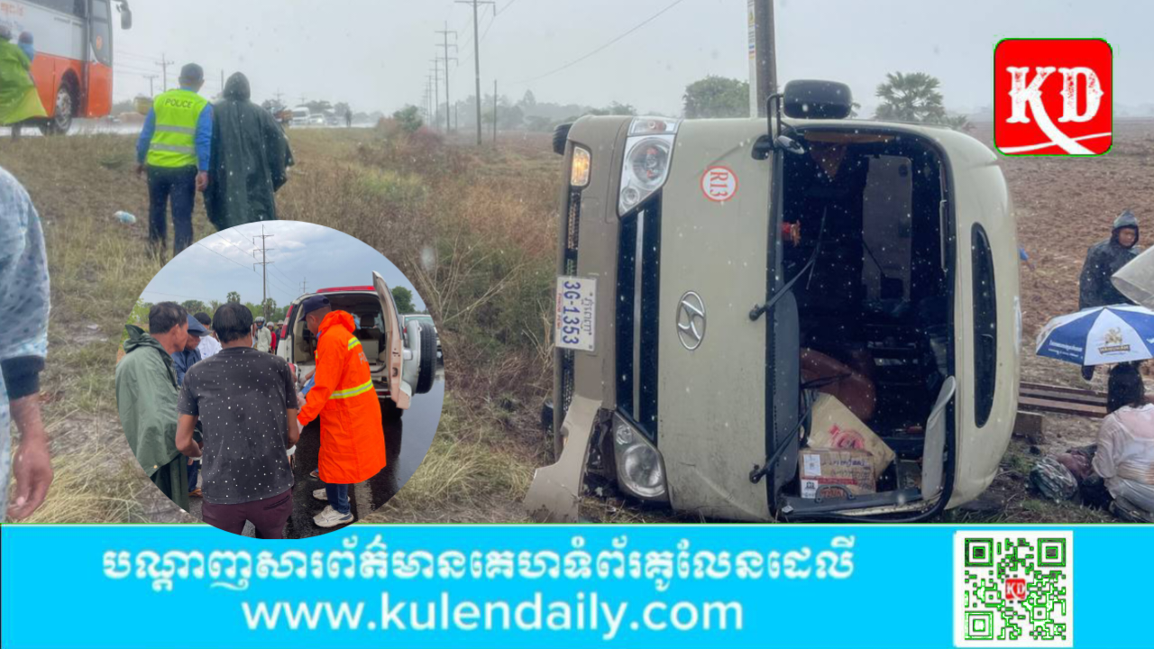 សមត្ថកិច្ចឲ្យដឹងថា មានរថយន្ត០១ គ្រឿងម៉ាក HYUNDAI COUNTY ពណ៌ សូកូឡា-ពងមាន់ ពាក់ស្លាកលេខ ភ្ភ្នំពេញ 3G-1353 បើកបរដោយឈ្មោះម៉ៅ រតនា ភេទប្រុស អាយុ៣៣ ឆ្នាំ រស់នៅភូមិ១ ឃុំព្រះពន្លា ក្រុងសេរីសោភ័ណ ខេត្តបន្ទាយមានជ័យ បើកបរពីលិចទៅកើត អ្នករួមដំណើរ០៦ នាក់ ស្គាល់អត្តសញ្ញាណ០២ នាក់ ៖