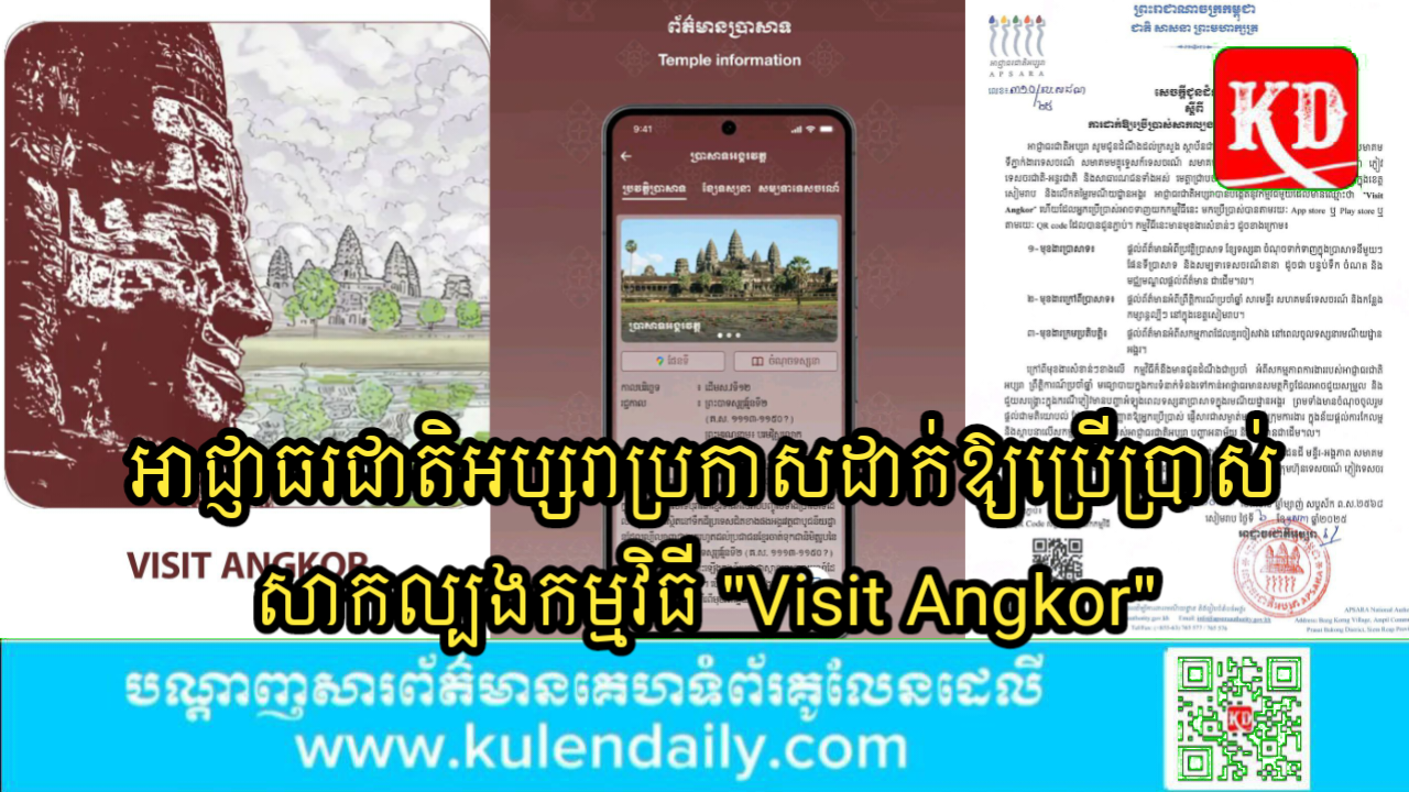 ខេត្តសៀមរាប ៖ កាលពីថ្ងៃទី៦ ខែឧសភា ឆ្នាំ២០២៥ អាជ្ញាធរជាតិអប្សរា បានប្រកាសជូនដំណឹងដល់ក្រសួង ស្ថាប័នជាតិ-អន្តរជាតិ អាជ្ញាធរដែនដី មន្ទីរ-អង្គភាព សមាគម ទីភ្នាក់ងារទេសចរណ៍ សមាគមមគ្គុទ្ទេសក៍ទេសចរណ៍ សមាគមដឹកជញ្ជូនភ្ញៀវទេសចរ ក្រុមហ៊ុនទេសចរណ៍ ភ្ញៀវ ទេសចរជាតិ-អន្តរជាតិ និងសាធារណជនទាំងអស់ឲ្យបានជ្រាបថា ដើម្បីចូលរួមលើកស្ទួយវិស័យទេសចរណ៍ក្នុងខេត្ត សៀមរាប និងលើកតម្លៃរមណីយដ្ឋានអង្គរ អាជ្ញាធរជាតិអប្សរាបានបង្កើតនូវកម្មវិធីមួយដែលមានឈ្មោះថា “Visit Angkor” ហើយដែលអ្នកប្រើប្រាស់អាចទាញយកកម្មវិធីនេះ មកប្រើប្រាស់បានតាមរយៈ App store ឬ Play store ឬ តាមរយៈ QR code ដែលបានជូនភ្ជាប់។