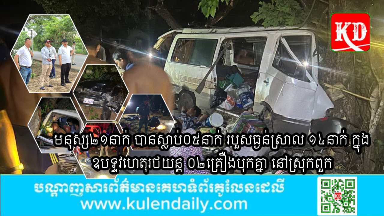 ខេត្តសៀមរាប ៖ នៅរសៀលថ្ងៃទី១៤ ខែឧសភា ឆ្នាំ២០២៥នេះ លោកឧត្តមសេនីយ៍ត្រី ណុប សារ៉ាក់ អ្នកនាំពាក្យ នៃស្នងការដ្ឋាននគរបាលខេត្តសៀមរាបបានបញ្ចាក់មកកាន់ទីភ្នាក់ងារសារព័ត៌មានគូលែនដេលីឲ្យដឹងថា ករណីរឿងគ្រោះថ្នាក់ចរាចរណ៍ កើតឡើងនៅថ្ងៃទី១៣ ខែឧសភា ឆ្នាំ២០២៥ វេលាម៉ោង២៣ និង០០នាទី នៅលើផ្លូវជាតិលេខ៦ ចំណុចចន្លោះបង្គោលគីឡូម៉ែត្រលេខ៣២៤-៣២៥ ស្ថិតនៅភូមិព្រៃក្មេង ឃុំខ្នាត ស្រុកពួក ខេត្តសៀមរាប រវាងរថយន្ត និងរថយន្ត មានមនុស្សចំនួន២១នាក់ ត្រូវបានស្លាប់០៥នាក់ របួសធ្ងន់ស្រាលចំនួន ១៤នាក់ និងមិនរងរបួសចំនួន០២នាក់។