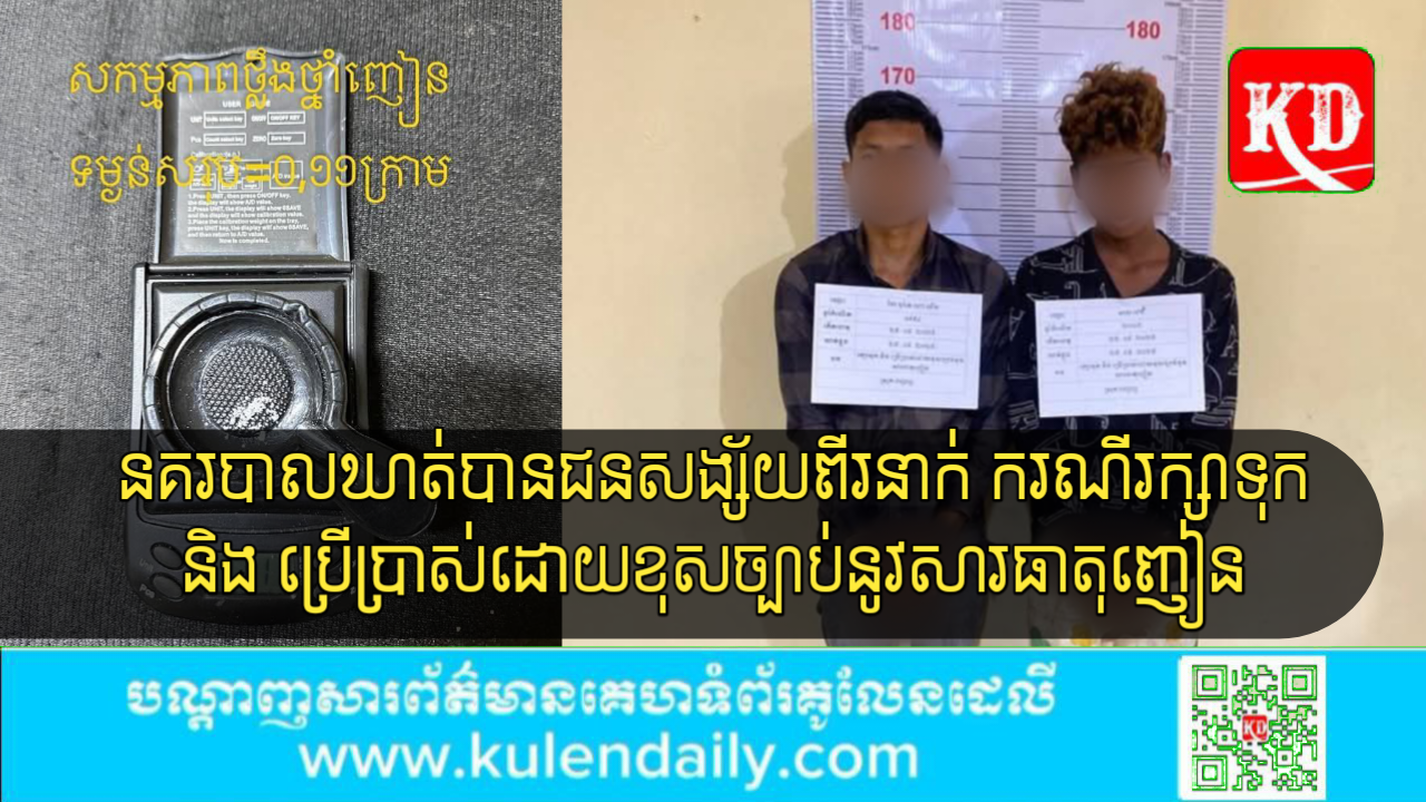 ខេត្តកណ្តាល ៖ កាលពីវេលាម៉ោង ០១ និង ៣០ នាទី ថ្ងៃទី ២៥ ខែឧសភា ឆ្នាំ២០២៥ នៅចំណុច ភូមិចតុទិស ឃុំវិហារលួង ស្រុកពញាឮ ខេត្តកណ្តាល នគរបាលឃាត់ខ្លួន ជនសង្ស័យចំនួន០២នាក់ក្នុងចំណោម ករណីរក្សាទុក និង ប្រើប្រាស់ដោយខុសច្បាប់នូវសារធាតុញៀន ដែលទី១-ឈ្មោះ មាស ជេប៊ី ហៅ ប៊ីភេទប្រុស អាយុ ១៨ ឆ្នាំ ជនជាតិខ្មែរ មុខរបរ មិនពិត មានទីលំនៅបច្ចុប្បន្ន ភូមិអំពិកដាំទឹក ឃុំវិហារលួង ស្រុកពញាឮ ខេត្តកណ្ដាល (ឃាត់ខ្លួន) មានសារធាតុញៀនក្នុងទឹកនោម(+) ទី២-ឈ្មោះ ហៃ បូរ៉ាត់ ហៅឈីវ ភេទប្រុស អាយុ ៣១ ឆ្នាំ ជនជាតិខ្មែរ មុខរបរ មិនពិត ទីលំនៅបច្ចុប្បន្ន ភូមិអំពិលដាំទឹក ឃុំវិហារលួង ស្រុកពញាឮ ខេត្តកណ្ដាល (ឃាត់ខ្លួន) មានសារធាតុញៀនក្នុងទឹកនោម(+) និងទី៣-ឈ្មោះ ហែម សុជាតិ ភេទប្រុស អាយុ ៣៣ ឆ្នាំ ជនជាតិខ្មែរ មុខរបរ មិនពិត ទីលំនៅបច្ចុប្បន្ន ភូមិធម្មត្រ័យ ឃុំផ្សារដែក ស្រុកពញាឮ ខេត្តកណ្ដាល (គេចខ្លួន)។