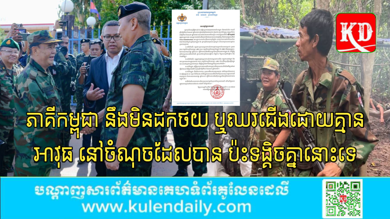 ខេត្តឧត្តរមានជ័យ ៖ អគ្គបញ្ជាការដ្ឋាន នៃកងយោធពលខេមរភូមិន្ទបញ្ជាក់ថា «ភាគីកម្ពុជា នឹងមិនដកថយ ឬឈរជើងដោយគ្មានអាវុធ នៅចំណុចដែលបាន ប៉ះទង្គិចគ្នានោះទេ ព្រោះទីតាំងនោះភាគីកម្ពុជាបានឈរជើងតាំងពីមុនពេលចុះហត្ថលេខាលើ អនុស្សរណៈនៃការយោគយល់គ្នា ឆ្នាំ២០០០ ស្តីពីការវាស់វែងនិងខណ្ឌសីមាព្រំដែនគោករវាង កម្ពុជា-ថៃ»។ នេះជាចំណុចដ៍សំខាន់ដែលមានបញ្ជាក់នៅក្នុងកិច្ចជំនួបចរចារវាងនាយឧត្តមសេនីយ៍ ម៉ៅ សុផាន់ អគ្គមេបញ្ជាការរង មេបញ្ជាការកងទ័ពជើងគោកនៃកងយោធពលខេមរភូមិន្ទ និងនាយឧត្តមសេនីយ៍ Pana Klaewblaudtuk មេបញ្ជាការកងទ័ពជើងគោកភូមិន្ទថៃ នៅការិយាល័យ ទំនាក់ទំនងកិច្ចការព្រំដែនកម្ពុជា-ថៃ ច្រកព្រំដែនចុងចម-អូរស្មាច់ នាថ្ងៃទី២៩ ខែឧសភា ឆ្នាំ២០២៥ វេលាម៉ោង១៥:៣០នាទីរសៀល ក្រោយពីមានព្រឹត្តិការណ៍ប៉ះទង្គិចប្រដាប់អាវុធរវាងកងទ័ពកម្ពុជា និងកងទ័ពថៃ កាលពី ព្រឹកថ្ងៃទី២៨ ខែឧសភា ឆ្នាំ២០២៥ ស្ថិតនៅភូមិតេជោមរកត ឃុំមរកត ស្រុកជាំក្សាន្ត ខេត្តព្រះវិហារ។ នេះបើយោងតាមសេចក្តីថ្លែងការណ៍របស់អគ្គបញ្ជាការដ្ឋាន នៃកងយោធពលខេមរភូមិន្ទកម្ពុជា នៅរសៀលនេះ។