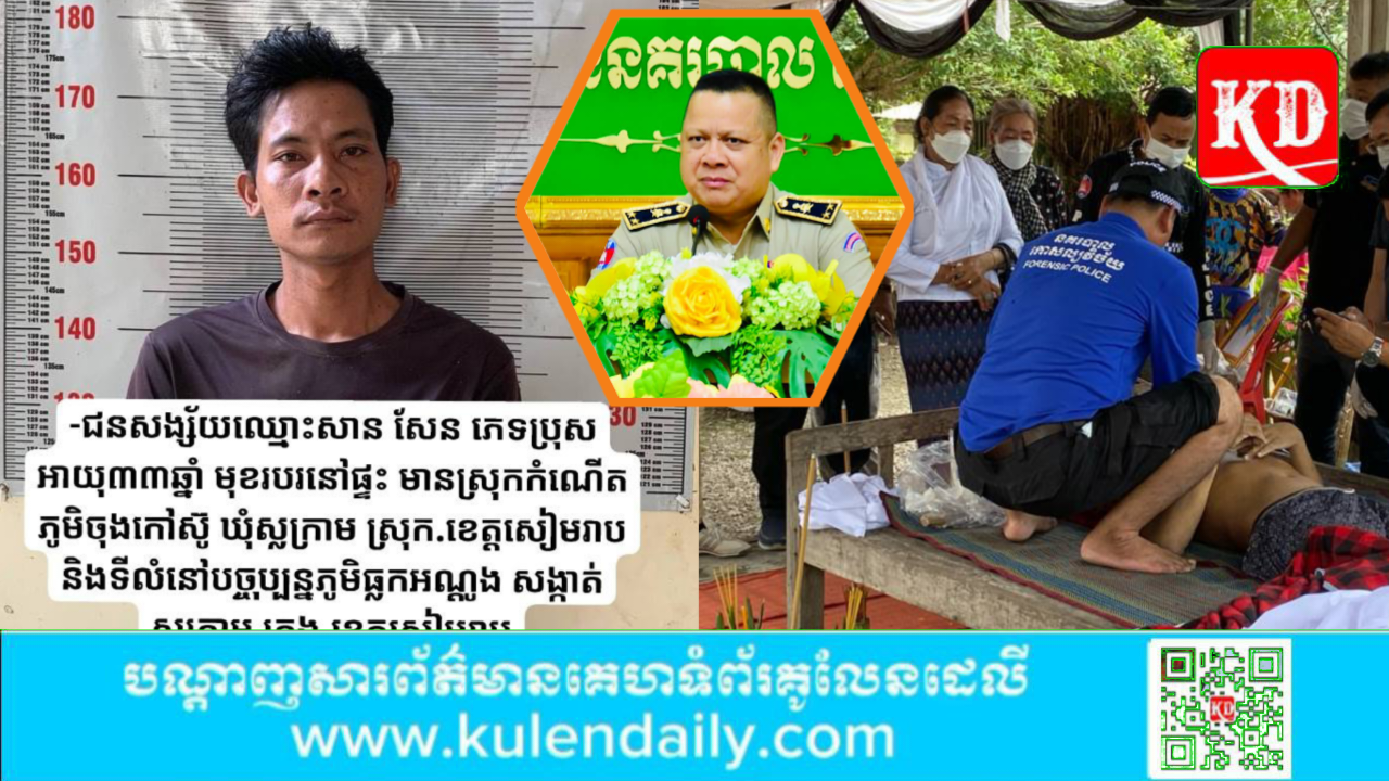 ខេត្តសៀមរាប៖ នៅវេលាម៉ោង០៩ និង០០នាទីថ្ងៃទី២៧ ខែកញ្ញា ឆ្នាំ២០២៥ លោកឧត្តមសេនីយ៍ទោ ហួត សុធី ស្នងការ នៃស្នងការដ្ឋាននគរបាលខេត្តសៀមរាប បានដឹកនាំបញ្ជាផ្ទាល់ នគរបាលជំនាញនៃស្នងការដ្ឋាន សហការជាមួយសមត្ថកិច្ចមូលដ្ឋាន បំបែកសំណុំរឿងឃាតកម្ម និងឃាត់ខ្លួនជនសង្ស័យម្នាក់ មានឈ្មោះ សាន សែន (អវិជ្ជមានសារធាតុញៀន) ភេទប្រុស អាយុ៣៣ឆ្នាំ មុខរបរនៅផ្ទះ មានស្រុកកំណើតភូមិចុងកៅស៊ូ ឃុំស្លក្រាម ស្រុកសៀមរាប ខេត្តសៀមរាប និងទីលំនៅបច្ចុប្បន្នភូមិធ្លកអណ្ដូង សង្កាត់ស្លក្រាម ក្រុងសៀមរាបខេត្តសៀមរាប (ប្រវត្តិទោសគ្មាន) ពាក់ព័ន្ធនឹងបទល្មើសជាក់ស្ដែងករណី អំពើហិង្សាដោយចេតនាមានស្ងានទម្ងន់ទោស ដោយមរណៈភាពនៃជនរងគ្រោះ (វាយនឹងអង្រែឈើ) កាលពីវេលាម៉ោង១៧ និង០០នាទីថ្ងៃទី២៦ ខែកញ្ញា ឆ្នាំ២០២៥ កន្លងទៅ។