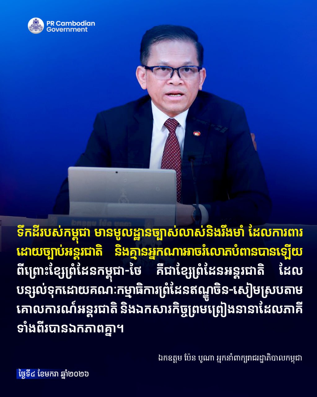 ឧត្តម ប៉ែន បូណា អ្នកនាំពាក្យរាជរដ្ឋាភិបាលកម្ពុជា ថ្ងៃទី៤ ខែមករា ឆ្នាំ២០២៦ ៖ “ទឹកដីរបស់កម្ពុជា មានមូលដ្ឋានច្បាស់លាស់និងរឹងមាំ ដែលការពារដោយច្បាប់អន្តរជាតិ និងគ្មានអ្នកណាអាចរំលោភបំពានបានឡើយ ពីព្រោះខ្សែព្រំដែនកម្ពុជា-ថៃ គឺជាខ្សែព្រំដែនអន្តរជាតិ ដែលបន្សល់ទុកដោយគណៈកម្មាធិការព្រំដែនឥណ្ឌូចិន-សៀម ស្របតាមគោលការណ៍អន្តរជាតិ និងឯកសារនិងកិច្ចព្រមព្រៀងនានាដែលភាគីទាំងពីរបានឯកភាពគ្នា”៕KD