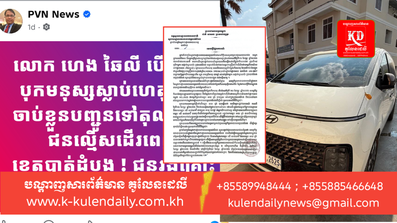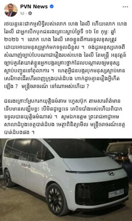 PVN NEWS បន្តបង្ហោះថា រថយន្តនេះជាកម្មសិទ្ធិរបស់លោក ហេង ឆៃលី ហើយលោក ហេង ឆៃលី ជាអ្នកបេីកបុកជនរងគ្រោះស្លាប់ថ្ងៃទី ១៦ ខែ កុម្ភៈ ឆ្នាំ ២០២៦ ។ លោក ហេង ឆៃលី គេចខ្លួនពីការទទួលខុសត្រូវ ដោយអោយមនុស្សម្នាក់មកទទួលជំនួស ។ ចង់ដូរមនុស្សគេចពីសំណាញ់ច្បាប់បែបណាជារឿងរបស់ហេង ឆៃលី តែមន្ត្រី អនុវត្តន៍ច្បាប់គួរតែឃាត់ខ្លួនអ្នកបង្ករគ្រោះថ្នាក់ដែលបណ្ដាលឲ្យមនុស្សស្លាប់បញ្ជូនទៅតុលាការ ។ ហេតុអ្វីជនបង្ករបុកមនុស្សស្លាប់មានសេរីភាពដេីរហេីរពេញក្រុងបាត់ដំបង ហាក់ដូចគ្មានរឿងអ្វីកេីតឡេីង ? មន្ត្រីចរាចរណ៍ ទៅណាអស់ហើយ ?