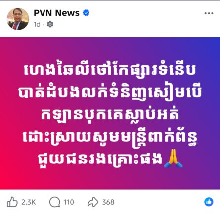 សូមជម្រាបជូនថា ការចេញនូវសេចក្ដីថ្លែងការ របស់អ្នកនាំពាក្យស្នងការដ្ឋាននគរបាលខេត្តបាត់ដំបងនាពេលនេះគឺបានធ្វើឡើងបន្ទាប់ពីមានការផ្សាយនៅបណ្ដាញសង្គមជាច្រើន ជាពិសេសនៅលើហ្វេសប៊ុក PVN NEWS ថា ហេងឆៃលីថៅកែផ្សារទំនើបបាត់ដំបងលក់ទំនិញសៀមបេីកឡានបុកគេស្លាប់អត់ដោះស្រាយសូមមន្ត្រីពាក់ព័ន្ធជួយជនរងគ្រោះផង🙏។