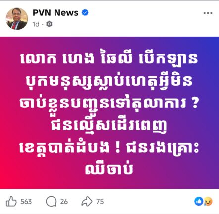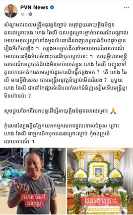 PVN NEWS បង្ហោះបន្ថែមថា លោក ហេង ឆៃលី បេីកឡានបុកមនុស្សស្លាប់ហេតុអ្វីមិនចាប់ខ្លួនបញ្ជូនទៅតុលាការ ? ជនល្មើសដេីរពេញខេត្តបាត់ដំបង ! ជនរងគ្រោះឈឺចាប់។