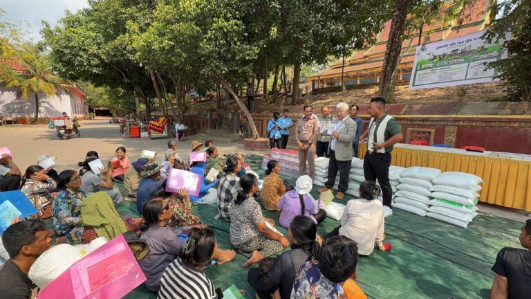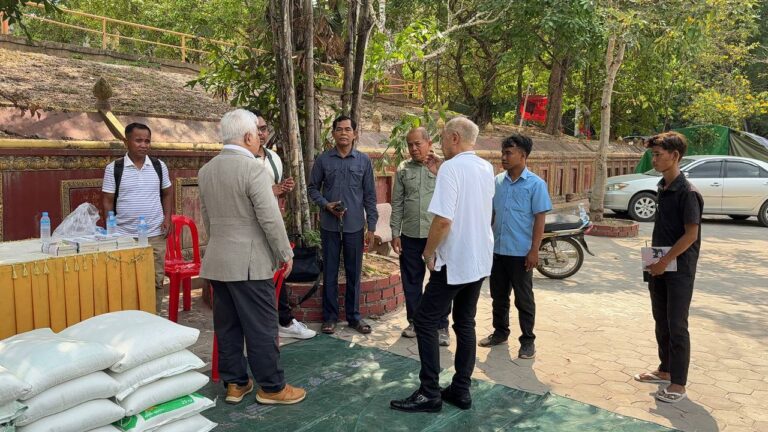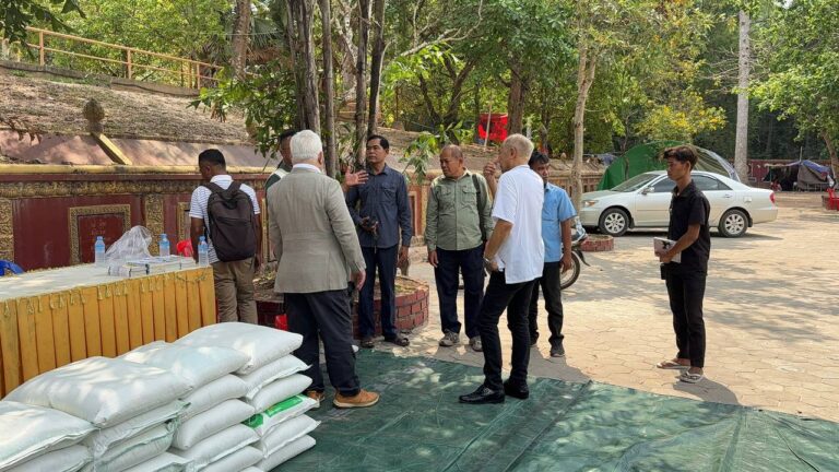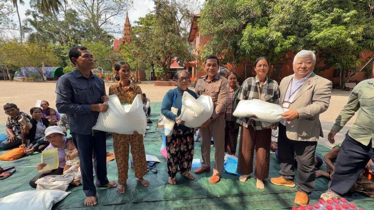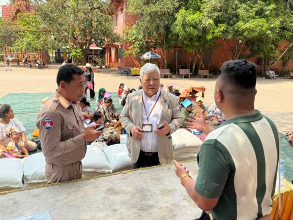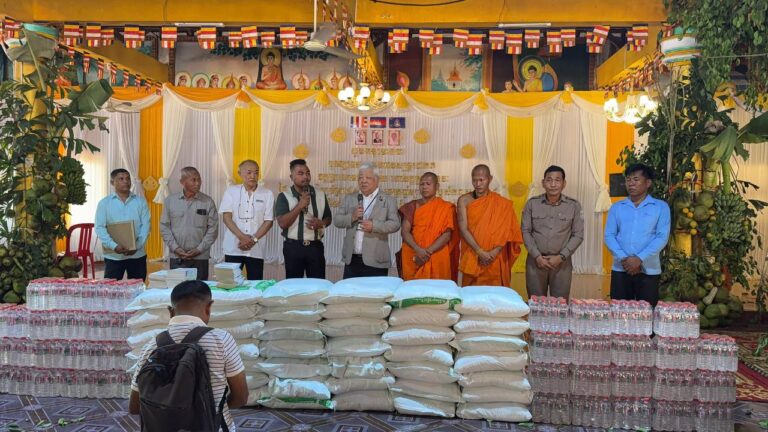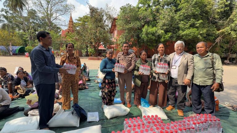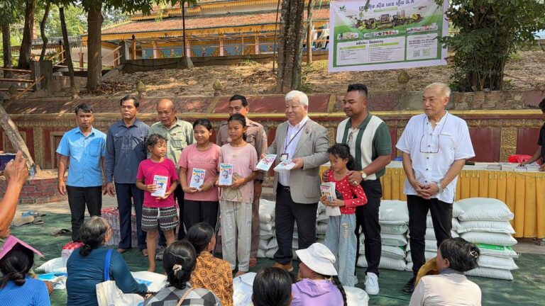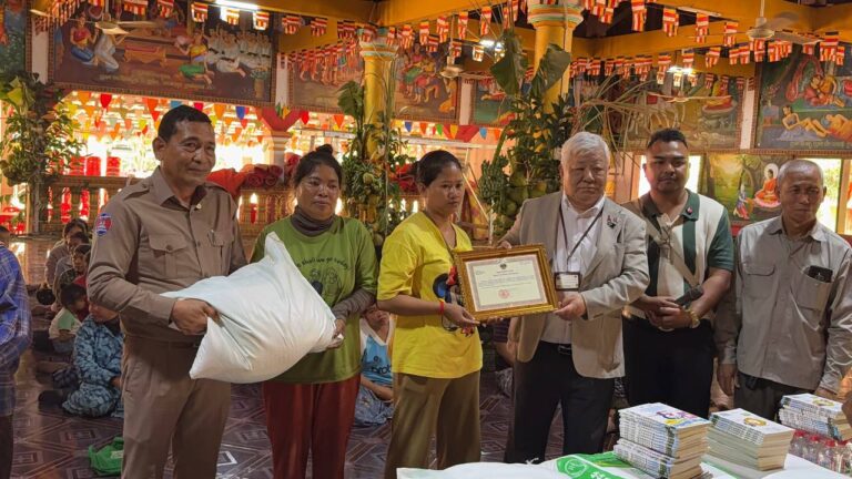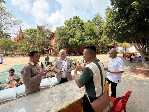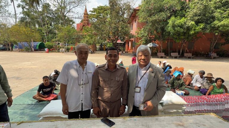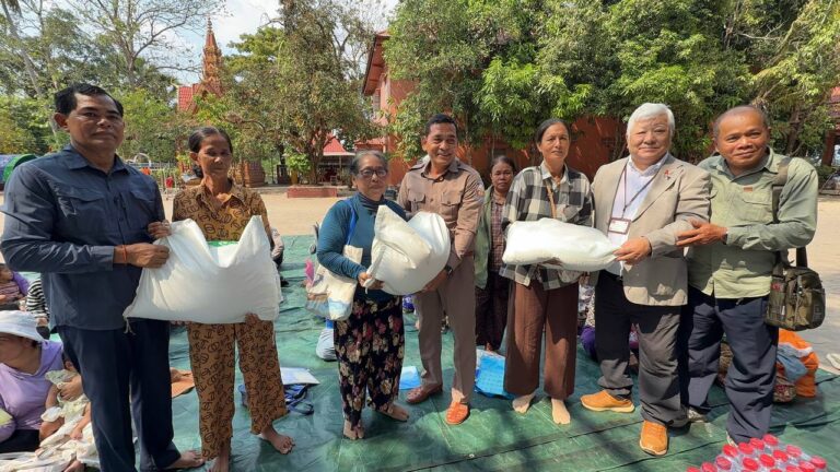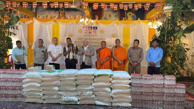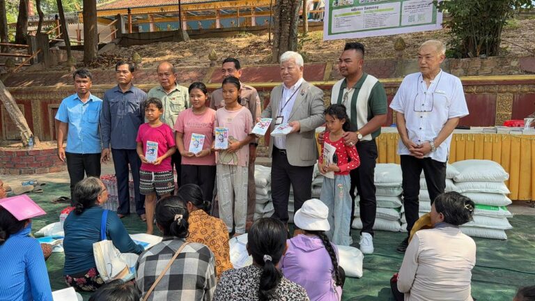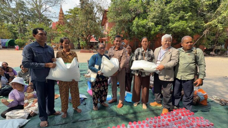 シェムリアップ:2026年3月20日午後、地震災害の際に日本の南西部、熊本県に寄付をしてくれたカンボジアの人々の善意に感謝し、長年カンボジアに住んでいた熊本国際化センター(KIC)の谷川正敏理事長(75歳)が帰国し、自身と熊本県の人々からの慈善寄付として、米1.6トンと飲料水約100リットルを持参しました。これらの物資は、タイの侵攻により故郷や村を追われ、シェムリアップのバンテアイ・スレイ地区にあるワット・プレア・ダック寺院とワット・プノン・プレア・テヴ寺院に今も滞在している80世帯、200人以上の難民に配布されました。バンテアイ・スレイ県知事のリン・ロット氏を議長として、TUIブルー・アンコール・クレース・ホテルのセールスマネージャー兼社長である石川勝義氏、イム・オドム氏、県議会代表、プレア・ダック村長、トベン村長、寺院住職、その他多くの地方自治体関係者らが参加し、式典が開催されました。