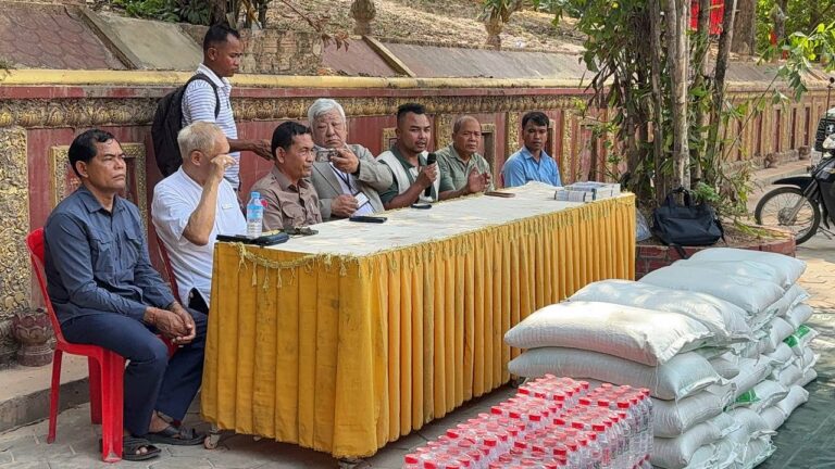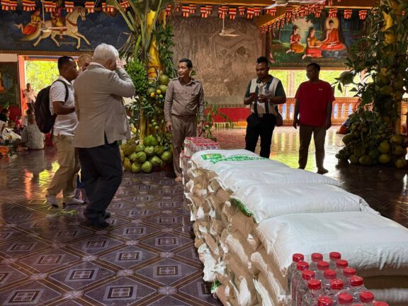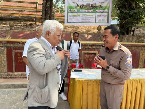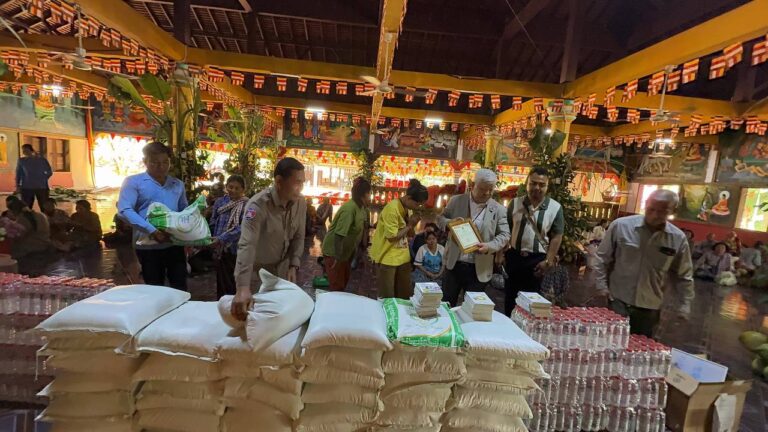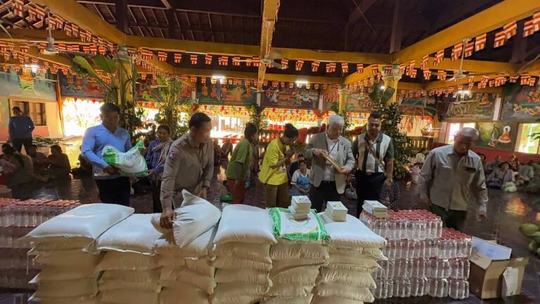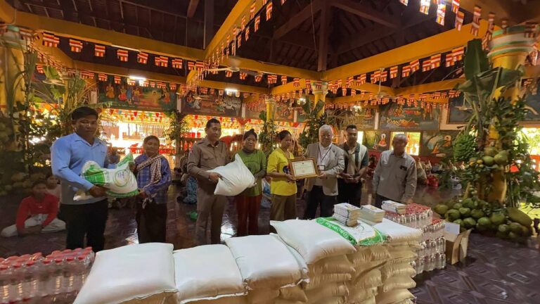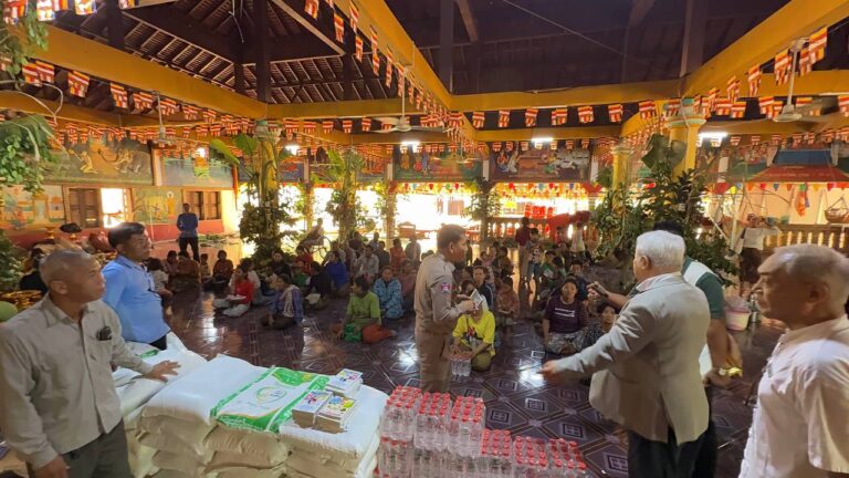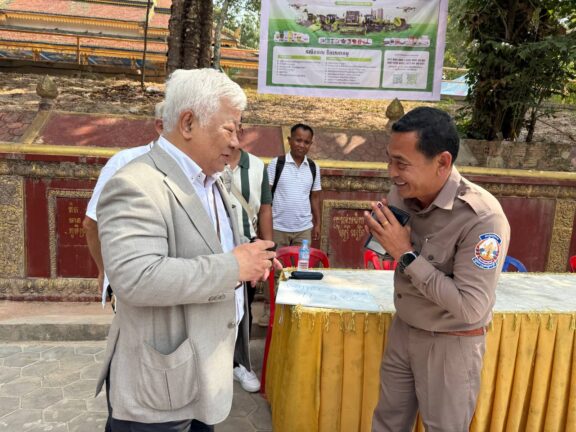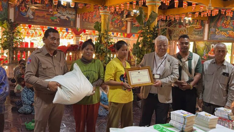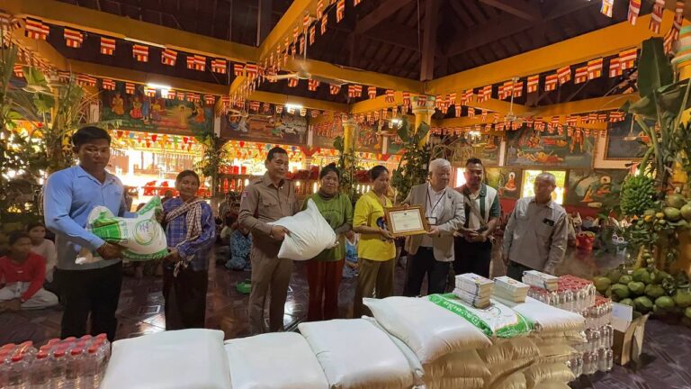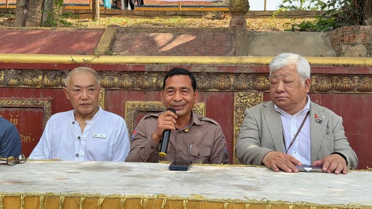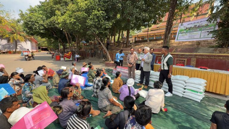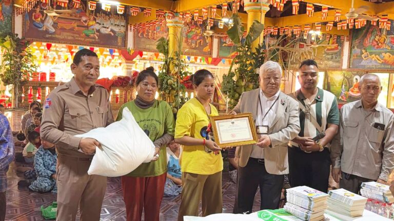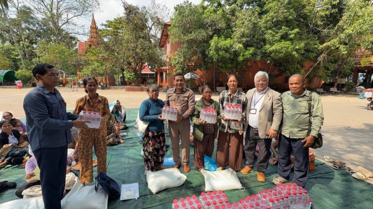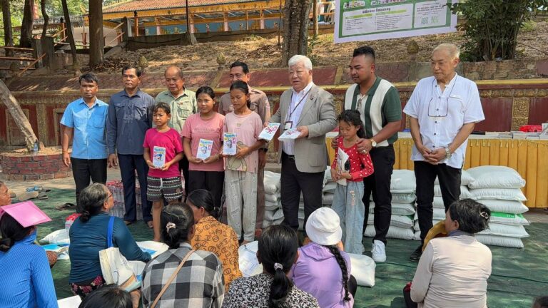 シェムリアップ:2026年3月20日午後、地震災害の際に日本の南西部、熊本県に寄付をしてくれたカンボジアの人々の善意に感謝し、長年カンボジアに住んでいた熊本国際化センター(KIC)の谷川正敏理事長(75歳)が帰国し、自身と熊本県の人々からの慈善寄付として、米1.6トンと飲料水約100リットルを持参しました。これらの物資は、タイの侵攻により故郷や村を追われ、シェムリアップのバンテアイ・スレイ地区にあるワット・プレア・ダック寺院とワット・プノン・プレア・テヴ寺院に今も滞在している80世帯、200人以上の難民に配布されました。バンテアイ・スレイ県知事のリン・ロット氏を議長として、TUIブルー・アンコール・クレース・ホテルのセールスマネージャー兼社長である石川勝義氏、イム・オドム氏、県議会代表、プレア・ダック村長、トベン村長、寺院住職、その他多くの地方自治体関係者らが参加し、式典が開催されました。
