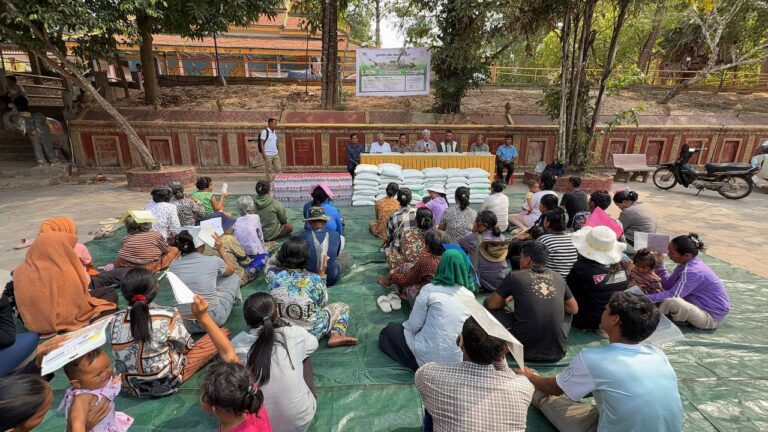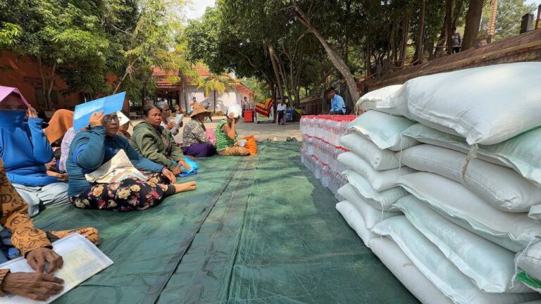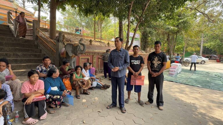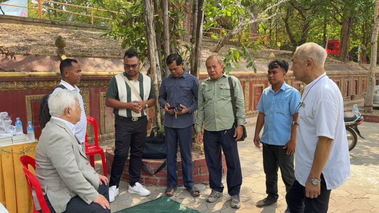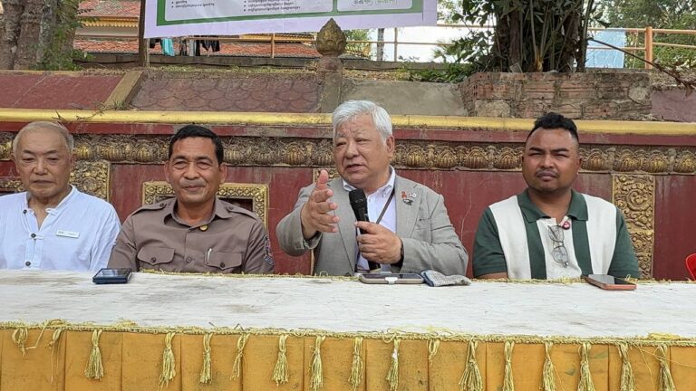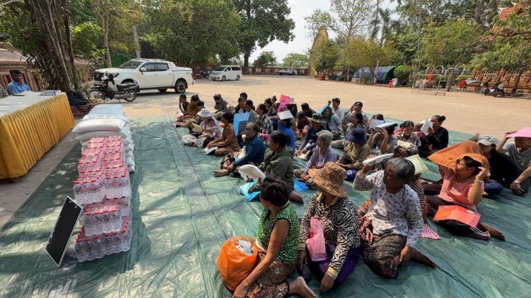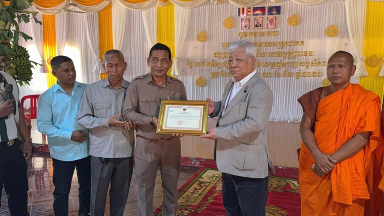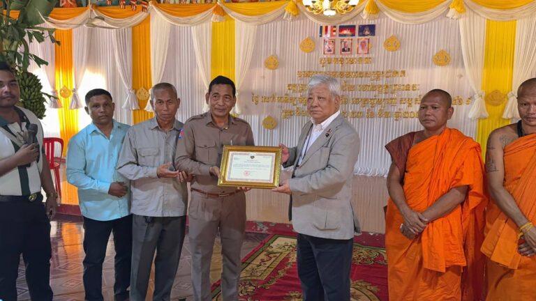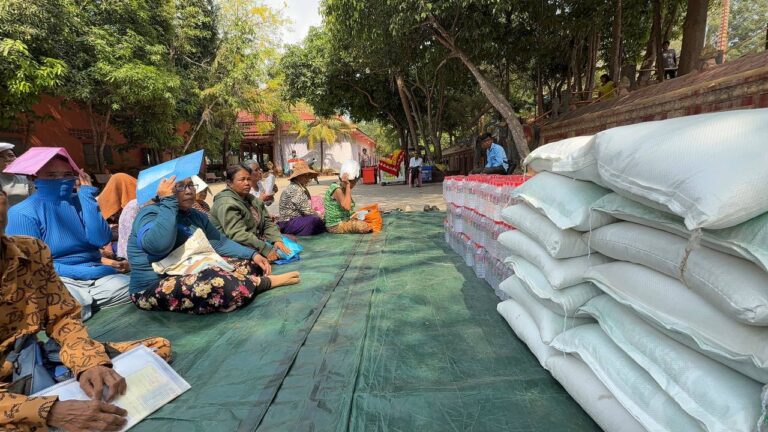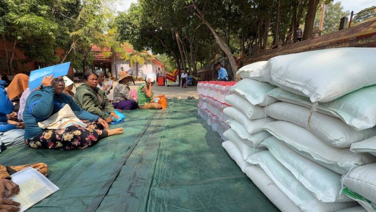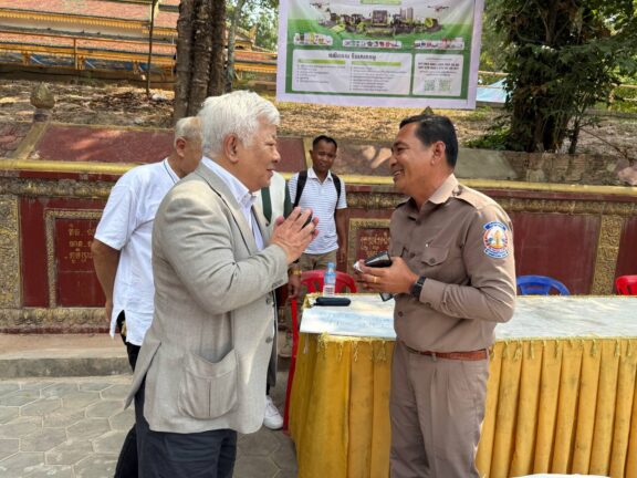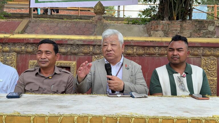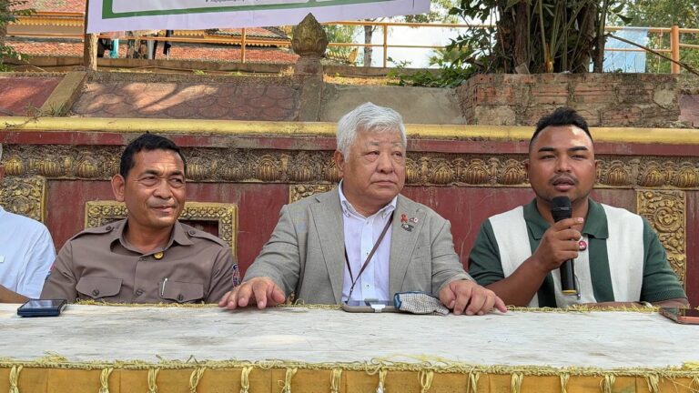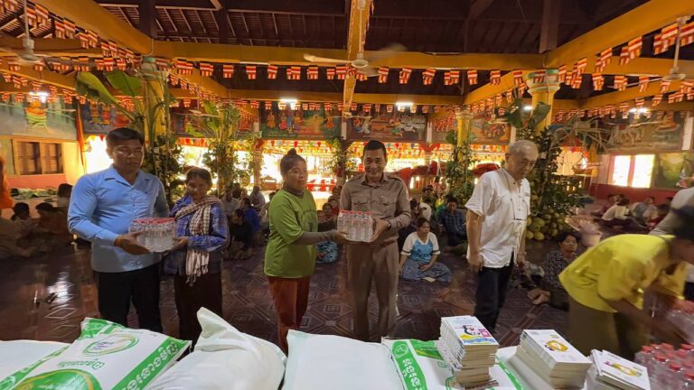 シェムリアップ:2026年3月20日午後、地震災害の際に日本の南西部、熊本県に寄付をしてくれたカンボジアの人々の善意に感謝し、長年カンボジアに住んでいた熊本国際化センター(KIC)の谷川正敏理事長(75歳)が帰国し、自身と熊本県の人々からの慈善寄付として、米1.6トンと飲料水約100リットルを持参しました。これらの物資は、タイの侵攻により故郷や村を追われ、シェムリアップのバンテアイ・スレイ地区にあるワット・プレア・ダック寺院とワット・プノン・プレア・テヴ寺院に今も滞在している80世帯、200人以上の難民に配布されました。バンテアイ・スレイ県知事のリン・ロット氏を議長として、TUIブルー・アンコール・クレース・ホテルのセールスマネージャー兼社長である石川勝義氏、イム・オドム氏、県議会代表、プレア・ダック村長、トベン村長、寺院住職、その他多くの地方自治体関係者らが参加し、式典が開催されました。