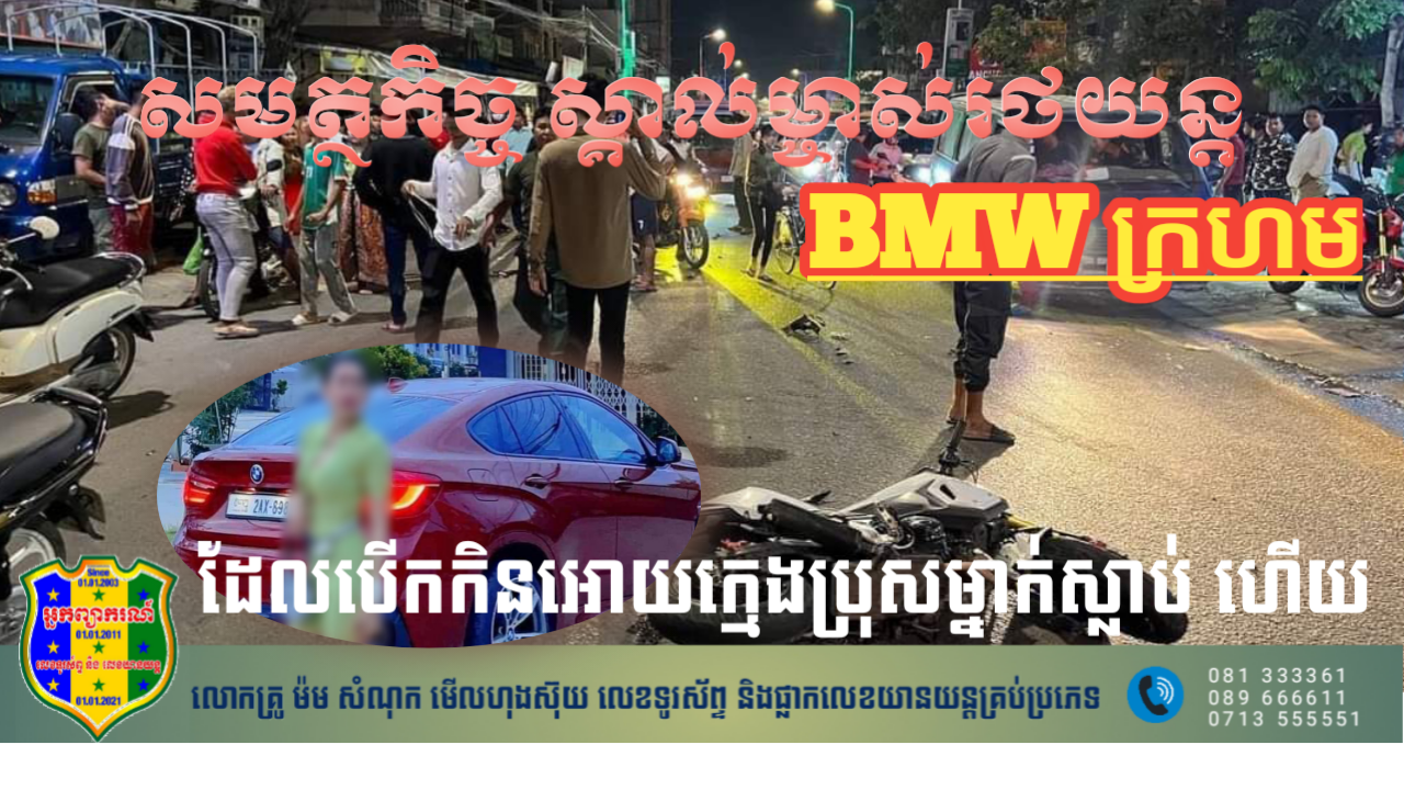 ប្រភពអោយដឹងថា រថយន្ត BMW ពណ៌ក្រហម ពាក់ស្លាកលេខ ភ្នំពេញ 2AX-8987 បើកកិនអោយក្មេងប្រុសម្នាក់ស្លាប់ រួចបន្ថែមល្បឿនបើកគេចខ្លួនបាត់ស្រមោល ក្នុងហេតុការណ៍គ្រោះថ្នាក់ចរាចរមួយ រវាង ម៉ូតូ០២គ្រឿង ដោយមួយក្នុងចំណោមនោះ បានបើកបញ្ច្រាសទិស ទៅបុកម៉ូតូមួយគ្រឿងទៀត បណ្ដាលឲ្យខ្ទាត់ជនរងគ្រោះទៅលើផ្លូវ ហើយត្រូវបានកិនដោយ រថយន្ត BMW កំពុងបើកឆ្លងកាត់។