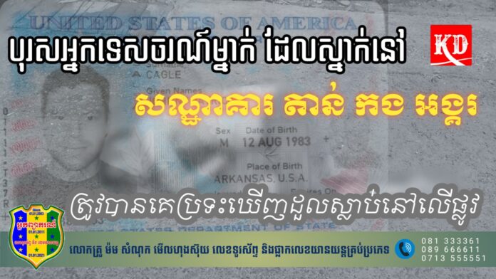 សមត្ថកិច្ចបានបន្តថា បុរសដែលជាជនបរទេសនោះមានឈ្មោះ CAGLE JOHNNY PATRICK ភេទប្រុស មានកម្ពស់ ១.៧១មែត្រ អាយុ៤០ឆ្នាំ ជនជាតិ អាមេរិកកាំង កាន់លិខិតឆ្លងដែនលេខ ៦៨៣២៧០៦៧៩ មុខរបរទេសចរណ៍ស្នាក់នៅបណ្ដោះអាសន្នក្នុង សណ្ឋាគារ តាន់កង អង្គរ ស្ថិតនៅភូមិវិហារចិន សង្កាត់ស្វាយដង្គំ ក្រុងខេត្តសៀមរាប ខេត្តសៀមរាប។