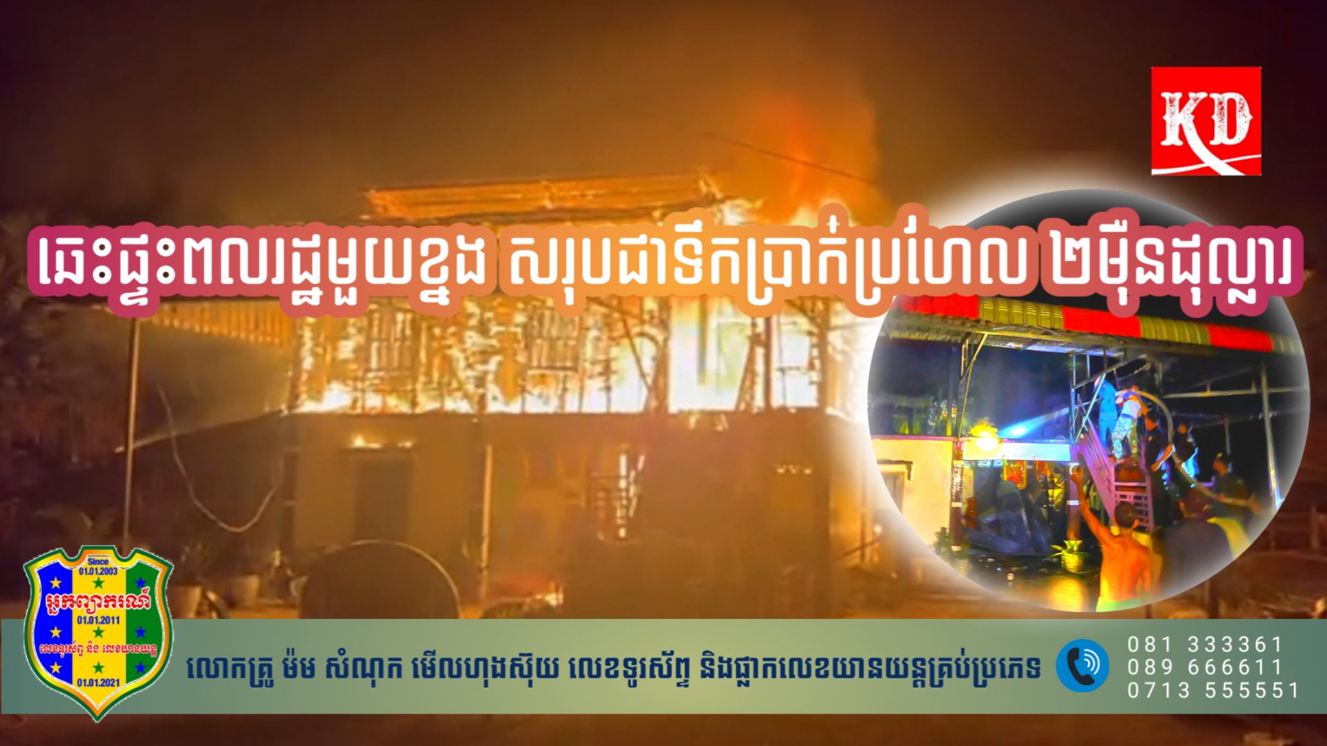 ខេត្តសៀមរាប៖ ករណីឆ្លងចរន្តអគ្គីសនី ទុស្សេបណ្ដាលឲ្យភ្លើងឆេះផ្ទះពលរដ្ឋមួយខ្នង ស្ថិតក្នុងភូមិគោកចាស់ ឃុំសសរស្តម្ភ ស្រុកពួក ខេត្តសៀមរាប សរុបជាទឹកប្រាក់ប្រហែល ២ម៉ឺនដុល្លារ កាលពីវេលាម៉ោង ២១ និង ៣០នាទីថ្ងៃទី១៩ ខែកុម្ភៈ ឆ្នាំ២០២៣។