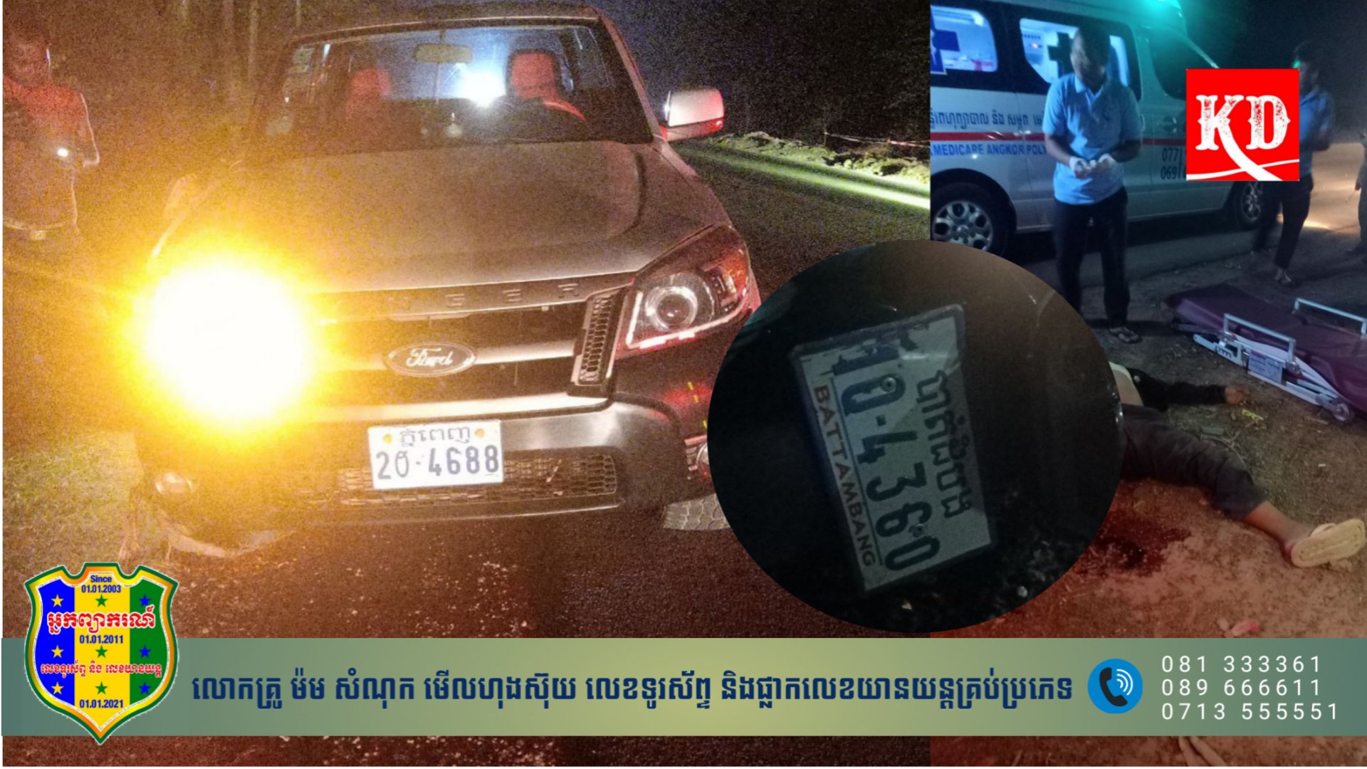 សមត្ថកិច្ចបានឲ្យដឹងថា មានករណីគ្រោះថ្នាក់ចរាចរមួយ រវាងម៉ូតូមួយគ្រឿងសេរ៑ីហុងដាទ្រីម2013 ពណ៌ខ្មៅ ផ្លាកលេខ បាត់ដំបង 1Q-4360 បើកបរក្នុងទិសដៅពីកើតទៅលិច បុកគ្នាជាមួយ រថយន្តមួយគ្រឿង Ford Ranger ពណ៌ទឹកប្រាក់ ផ្លាកលេខ ភ្នំពេញ 2O-4688 ដែលធ្វើដំណើរក្នុងទិសដៅច្រាសគ្នា។