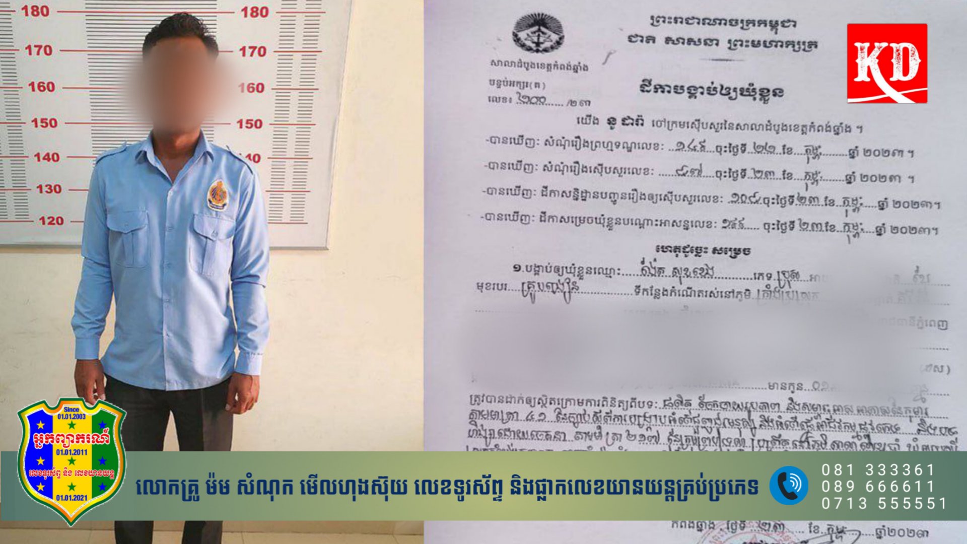 សមត្ថកិច្ចបន្តថា ការឃាត់ខ្លួននេះធ្វើឡើងតាម ការបញ្ជារបស់លោកស្នងការ នៃស្នងការដ្ឋាននគរបាលខេត្តកំពង់ឆ្នាំង និងមានការសម្របសម្រួលពីស្ថាប័នអយ្យការអមសាលាដំបូងខេត្ត ទៅតាមពាក្យបណ្ដឹងរបស់អាណាព្យាបាល កុមារីរងគ្រោះ។