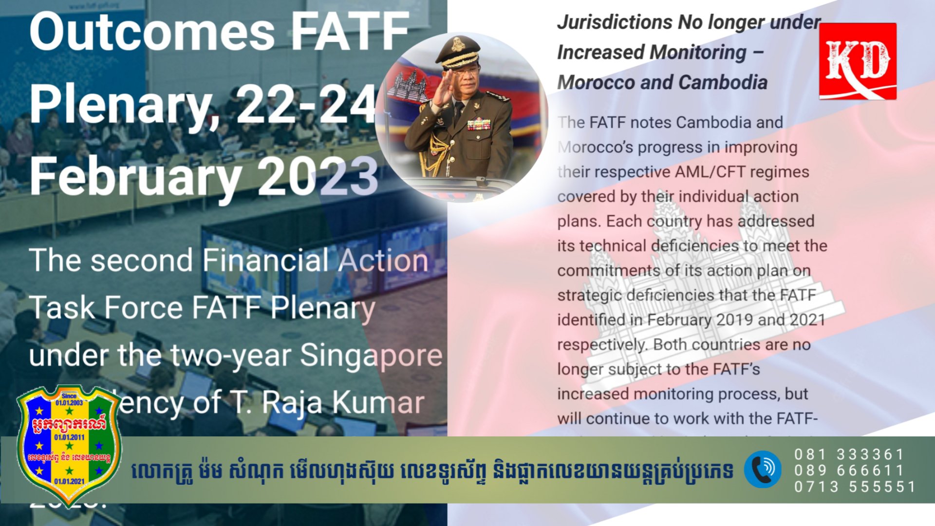 ខេត្តសៀមរាប៖ អង្គការឃ្លាំមើលការលាងលុយ និងឧក្រិដ្ឋកម្មហិរញ្ញវត្ថុអន្តរជាតិ (FATF) ដែលមានមូលដ្ឋាននៅទីក្រុងប៉ារីស ប្រទេសបារាំង បានប្រកាសជាផ្លូវការក្នុងការដកប្រទេសកម្ពុជាចេញពី «បញ្ជីប្រផេះ» នៃក្រុមប្រទេសដែលមានហានិភ័យខាងលាងលុយកខ្វក់ហើយ នៅល្ងាចថ្ងៃទី២៤ ខែកុម្ភៈ ឆ្នាំ២០២៣នេះ។