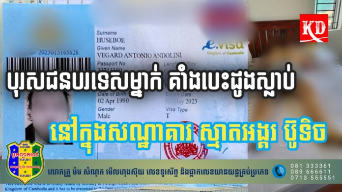 សមត្ថកិច្ចបន្តថា បុរសដែលបានស្លាប់បាត់បង់ជីវិតនោះ មានឈ្មោះ HUSEB VEGARD ANTONIO ANDOLINI ភេទប្រុស កម្ពស់ ១.៨៣ម៉ែត្រ អាយុ ៣៣ឆ្នាំ ជាជនជាតិ ន័រវែស កាន់លិខិតឆ្លងដែនលេខ៣២៧១៣៣៨០ មានមុខរបរ ជាអ្នកទេសចរណ៍ ស្នាក់នៅបណ្ដោះអាសន្នទីតាំងកើតហេតុខាងលើ។សមត្ថកិច្ចទទួលបានការបំភ្លឺ អំពីស្ត្រីម្នាក់មានឈ្មោះ វុិច ចាន់វី អាយុ ៣៩ ឆ្នាំ ទីលំនៅបច្ចុប្បន្នសង្កាត់គីឡូម៉ែត្រលេខ ៦ ខណ្ឌឬស្សីកែវ រាជធានីភ្នំពេញ ដែលត្រូវជាមិត្តស្រីរបស់សពថា សព្វថ្ងៃនាងរស់នៅទីក្រុងភ្នំពេញហើយនៅក្នុងខែតុលាឆ្នាំ ២០២២ នាងបានទាក់ទងស្រឡាញ់គ្នាជាមួយជាមួយគាត់(សព) តាមរយៈកម្មវិធី Tagged តែមិនទាន់បានជួបមុខគ្នាផ្ទាល់នៅឡើយទេ រហូតដល់ថ្ងៃទី ១៤ ខែកុម្ភៈឆ្នាំ ២០២៣ គាត់(សព)បានធ្វើដំណើរមកស្រុកខ្មែរតាមច្រកអន្តរជាតិភ្នំពេញ ហើយចាប់តាំងពីខ្ញុំស្គាល់គាត់មកពុំដែលឃើញគាត់មានជំងឺឈឺអ្វីទេ គ្រាន់តែឃើញគាត់ប្រើបំពង់ហឺត គាត់ប្រាប់ខ្ញុំថាគាត់មានជំងឺហឺត។ រហូតថ្ងៃទី ២២ ខែកុម្ភៈឆ្នាំ ២០២៣ អ្នកទាំងពីរបាននាំគ្នាមកលេងខេត្តសៀមរាប ដោយស្នាក់នៅស្មាតអង្គរប៊ូទិច បន្ទប់លេខ 411 ស្នាក់នៅដើរលេងក្នុងខេត្តសៀមរាបធម្មតា គាត់(សព)ពុំមានជំងឺឈឺអ្វីនោះទេ រហូតដល់ថ្ងៃទី ២៦ ខែកុម្ភៈឆ្នាំ ២០២៣ វេលាម៉ោង ៤ និង ០០ នាទីទៀបភ្លឺរូបនាងឃើញគាត់គេងដកដង្ហើមធម្មតា លុះដល់វេលាម៉ោង ៧ និង ០០ នាទី ថ្ងៃខែឆ្នាំដដែលស្រាប់តែមិនឮសំឡេងគាត់ស្រម៉ុកដកដង្ហើមសោះ ភ្លាមនោះរូបនាងបានដាស់គាត់(សព) តែគាត់មិនបានដឹងខ្លួនទេ រូបនាងក៏ចុះមកប្រាប់ខាងប៊ូទិចឱ្យជួយហៅគ្រូពេទ្យ មួយសន្ទុះក្រោយមកពេទ្យបានមកដល់ហើយពិនិត្យ រួចគាត់ប្រាប់ថាមិត្តប្រុសរបស់នាងបានស្លាប់បាត់ទៅហើយ។