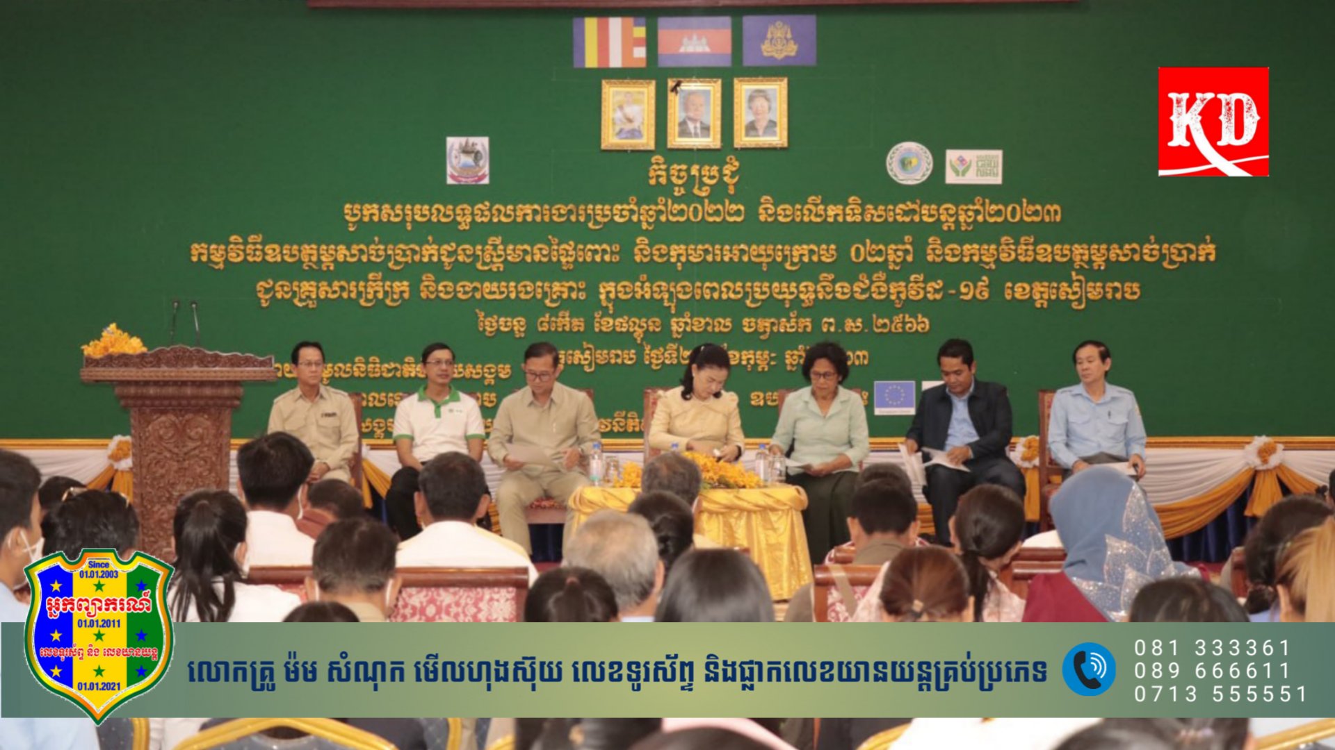 ខេត្តសៀមរាប៖ នាព្រឹកថ្ងៃទី២៧ខែកុម្ភះ ឆ្នាំ២០២៣ មន្ទីរសង្គមកិច្ច អតីតយុទ្ធជននិងយុវនីតិសម្បទា ខេត្តសៀមរាប រៀបចំកិច្ចប្រជុំបូកសរុបលទ្ធផលការងារប្រចាំឆ្នាំ២០២២ និងលើកទិសដៅបន្តឆ្នាំ២០២៣ របស់កម្មវិធីឧបត្ថម្ភសាច់ប្រាក់ជូនស្រ្តីមានផ្ទៃពោះ និងកុមារអាយុក្រោម២ឆ្នាំ និងកម្មវិធីឧបត្ថម្ភសាច់ប្រាក់ជូនគ្រួសារក្រីក្រ និងងាយរងគ្រោះក្នុងអំឡុងពេលប្រយុទ្ធនឹងជម្ងឺកូវីដ ១៩ ក្រោមអធិបតីភាពលោកស្រី យូ សុភា អភិបាលរងនៃគណៈអភិបាលខេត្ត លោកជំទាវ ស៊ិន ណម ប្រធានគណៈកម្មាធិការពិគ្រោះយោបល់កិច្ចការស្ត្រី និង កុមារខេត្ត ,លោក យឺន ហុងឆាត់ ប្រធាននាយកដ្ឋានគ្រប់គ្រងសេវា និង របបឧបត្ថម្ភតាវ កាលិក នៃអគ្គនាយកដ្ឋានមូលនិធិជាតិជំនួយសង្គម ព្រមទាំងអស់លោកលោកស្រីនៃមន្ទីរពាក់ពន្ធ័ និង មានការចូលរួមពីអស់ លោកលោកស្រីជាមន្ត្រីការិយាល័យសង្គមកិច្ចនិងសុខុមាលភាពសង្គមក្រុង ស្រុក មេឃុំ ចៅសង្កាត់ និង មន្ត្រីប្រតិបត្តិកម្មវិធី ប្រមាណ២២៤នាក់ចូលរួម នៅសាលប្រជុំសាលាខេត្តសៀមរាប។