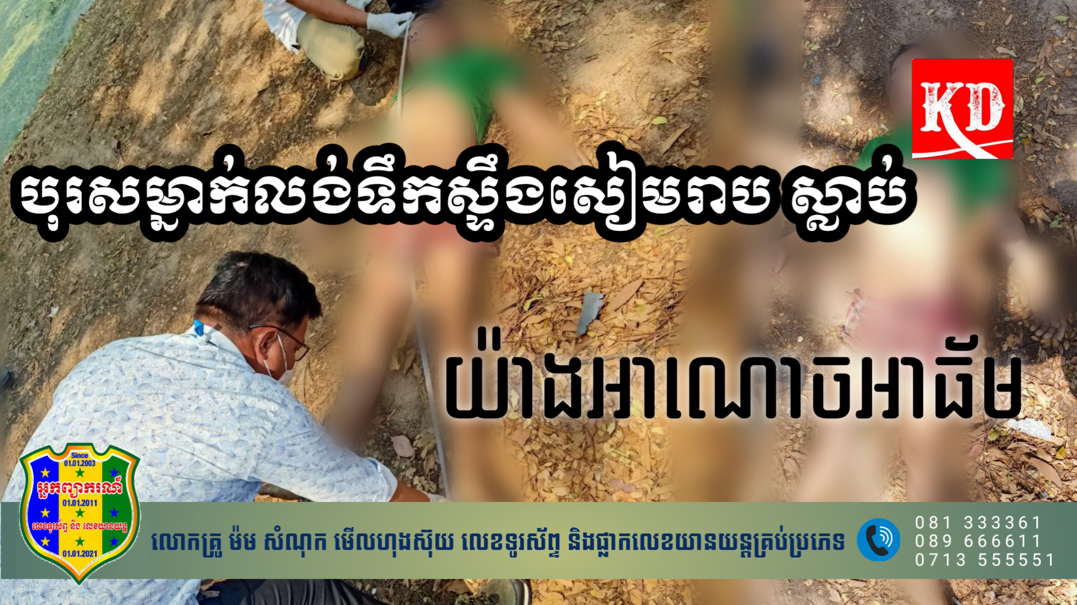 ខេត្តសៀមរាប៖ សេចក្ដីរាយការណ៍របស់សមត្ថកិច្ចបានឲ្យដឹងថា បុរសម្នាក់បានលង់ទឹកស្ទឹងសៀមរាប ស្លាប់យ៉ាងអាណោចអាធ័ម នៅត្រង់ចំណុចក្រុមទី១ ស្ថិតនៅភូមិស្លក្រាម សង្កាត់ស្លក្រាម ក្រុងសៀមរាប ខេត្តសៀមរាប កាលពីព្រឹកថ្ងៃទី០៤ ខែមិនា ឆ្នាំ២០២៣។