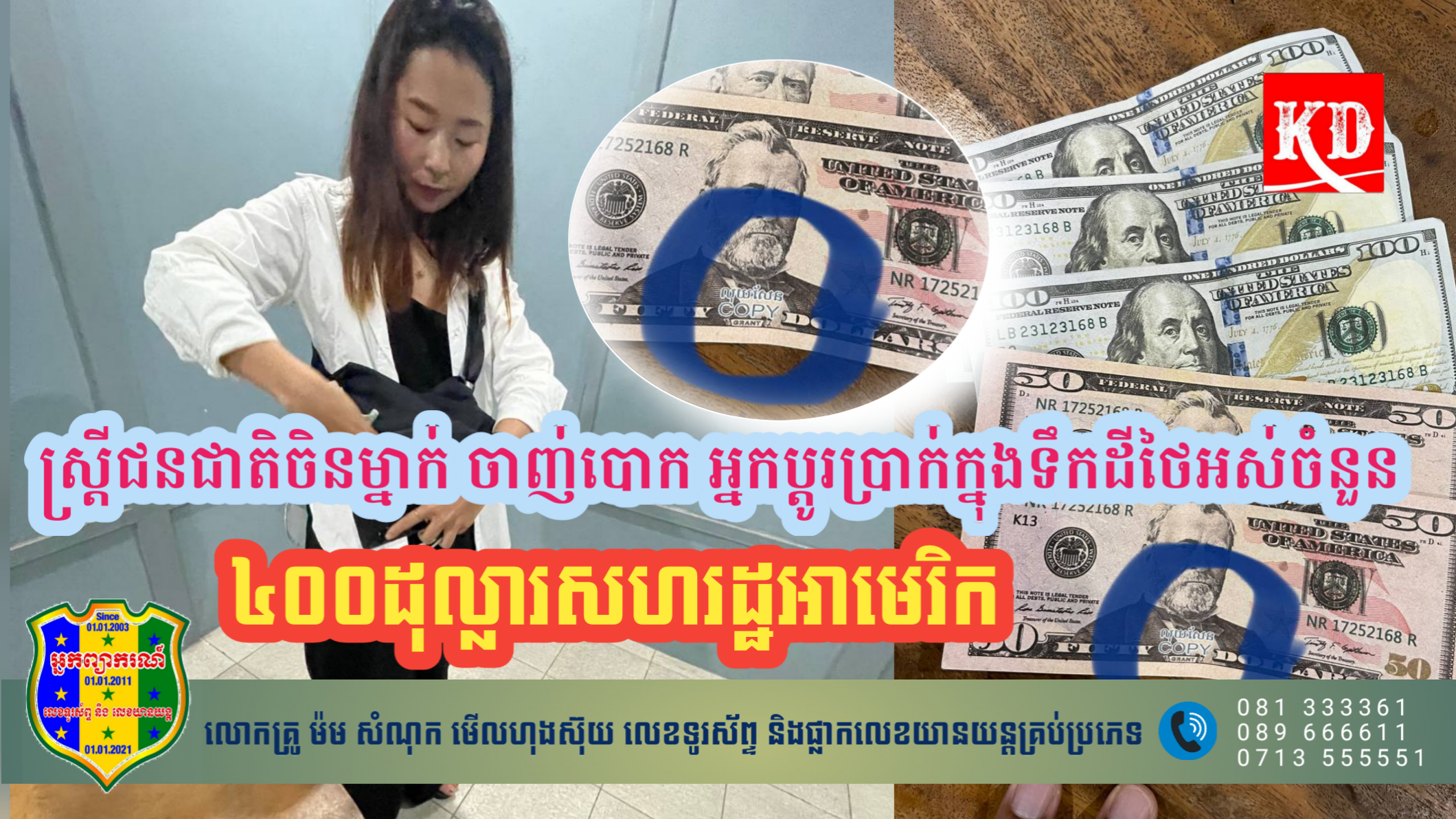 ខេត្តសៀមរាប៖ រឿងរ៉ាវដ៏គួរឱ្យហួសចិត្ត ស្ត្រីជនជាតិចិនម្នាក់ សង្ស័យថាបានចាញ់បោក អ្នកប្ដូរប្រាក់ក្នុងទឹកដីថៃ មិនច្បាស់ទីតាំង ខណៈពេលដែលស្ត្រីរូបនោះ បានធ្វើដំណើរឆ្លងដែនពីប្រទេសថៃមកប្រទេសកម្ពុជា ហើយព្យាយាមធ្វើការប្ដូរប្រាក់ ពីប្រាក់បាតមកជាប្រាក់ដុល្លារ តែអ្វីដែលគាត់ទទួលបានមកនោះ គឺទឹកប្រាក់ចំនួន ៤០០ដុល្លារសហរដ្ឋអាមេរិក សម្រាប់សែនខ្មោចទៅវិញ។ នេះបើយោងតាមការឲ្យដឹង ពីសមត្ថកិច្ចនៃនាយកដ្ឋានអន្តោប្រវេសន៍ខេត្តសៀមរាប នៅរសៀលថ្ងៃទី ១១ ខែមីនាឆ្នាំ ២០២៣ នេះ។