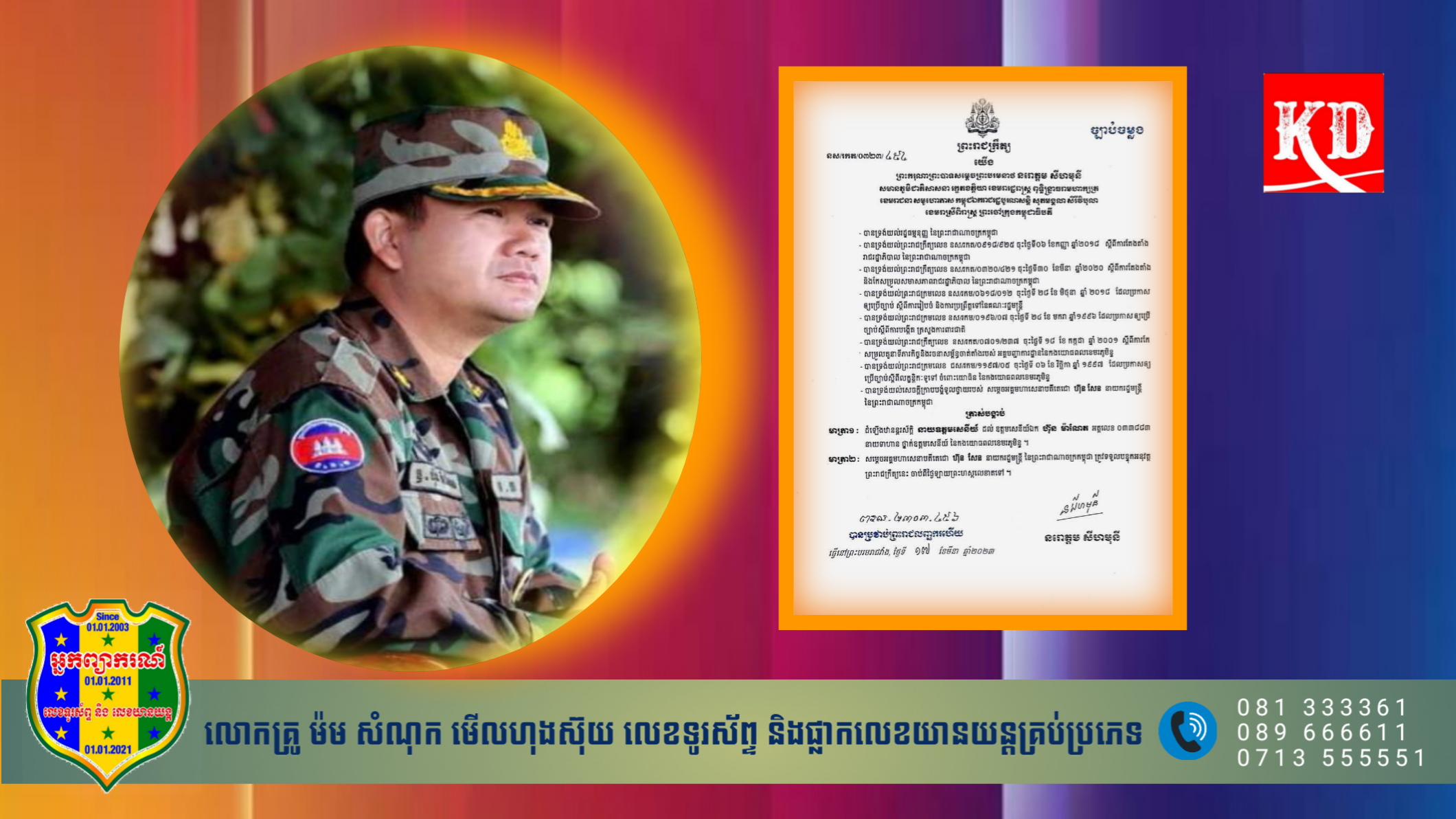 រាជធានីភ្នំពេញ៖ ព្រះករុណា ព្រះបាទ សម្តេចព្រះ បរមនាថ នរោត្តម សីហមុនី ព្រះមហាក្សត្រនៃព្រះរាជាណាចក្រកម្ពុជា បានសព្វព្រះរាជហឫទ័យ ចេញព្រះរាជក្រឹត្យដំឡើងឋានន្តរស័ក្តិដល់ ឯកឧត្តមបណ្ឌិត ហ៊ុន ម៉ាណែត ជាថ្នាក់នាយឧត្តមសេនីយ៍ នៃកងយោធពលខេមរភូមិន្ទ តាមព្រះរាជក្រឹត្យលេខ នស/រកត/០៣២៣/៤៥៤ នៅថ្ងៃទី ១៧ ខែមីនាឆ្នាំ ២០២៣នេះ។