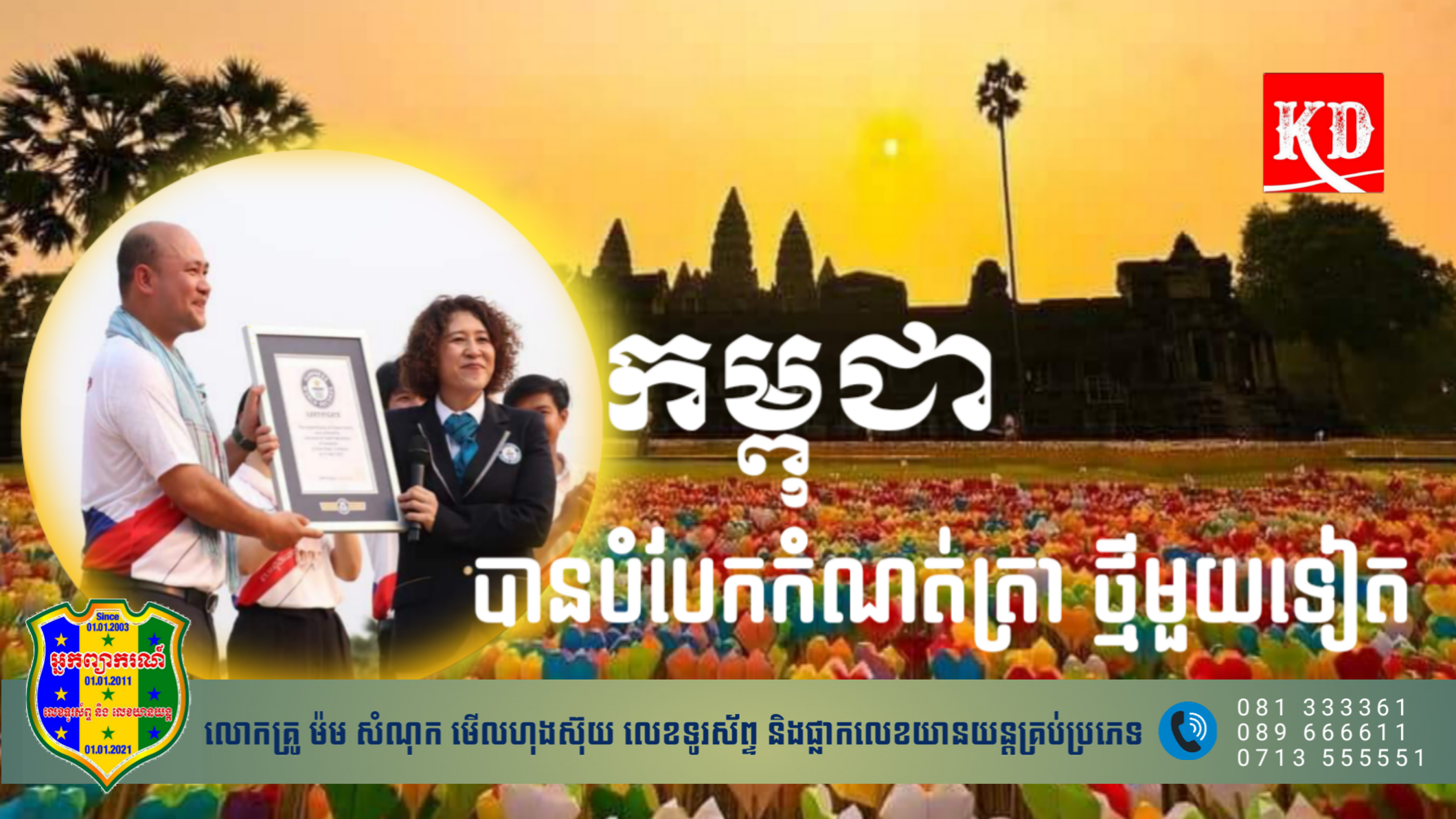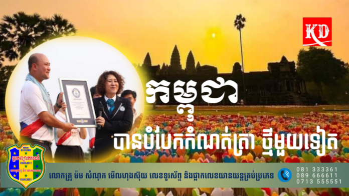 ខេត្តសៀមរាប៖ នៅក្នុងបរិវេណនៃប្រាសាទអង្គរវត្ត ដ៍ស័ក្តសិទ្ធិ ល្បីល្បាញរបស់កម្ពុជា មានព្រឹត្តិការណ៍ដ៏មហស្ចារ្យ ថ្មីមួយទៀតហើយ នោះគឺការបំបែកឯតទគ្គកម្ម «បេះដូងក្រដាសច្រើនជាងគេលើពិភពលោក» ដោយគណៈកម្មការកំណត់ត្រាពិភពលោក (Guinness world records) នៅរសៀលថ្ងៃទី១១ ខែមេសា ឆ្នាំ២០២៣នេះ។តាមរយៈការរាប់យ៉ាងយកចិត្តខ្ពស់បំផុត របស់គណៈកម្មការកំណត់ត្រាពិភពលោក(Guinness world records) បានឱ្យដឹងថា បេះដូងដែលមានអ្នកចូលរួមបត់យ៉ាងច្រើននេះ មានចំនួនរហូតដល់ ៣.៩១៧.៨០៥ (បីលានប្រាំបួនសែនមួយម៉ឺនប្រាំពីរពាន់ប្រាំបីរយប្រាំ)ឯណោះ។ជាមួយនឹងលទ្ធផលនេះកម្ពុជា អាចបំបែកកំណត់ត្រាពិភពលោកថ្មី ដោយការបត់បេះដូងក្រដាសមានចំនួនច្រើនជាងកំណត់ត្រាចាស់ របស់ប្រទេសអង់គ្លេស ដែលមានត្រឹមតែ ៥៣.៧០៤ បេះដូងប៉ុណ្ណោះ កាលពីឆ្នាំ២០១៩។ដូច្នេះហើយទើប គណៈកម្មការកំណត់ត្រាពិភពលោក (Guinness world records) បានប្រកាសថា កម្ពុជាជាប្រទេសដែលបំបែកកំណត់ត្រាថ្មីរបស់ពិភពលោក គឺ «បេះដូងក្រដាសច្រើនជាងគេលើពិភពលោក»។
