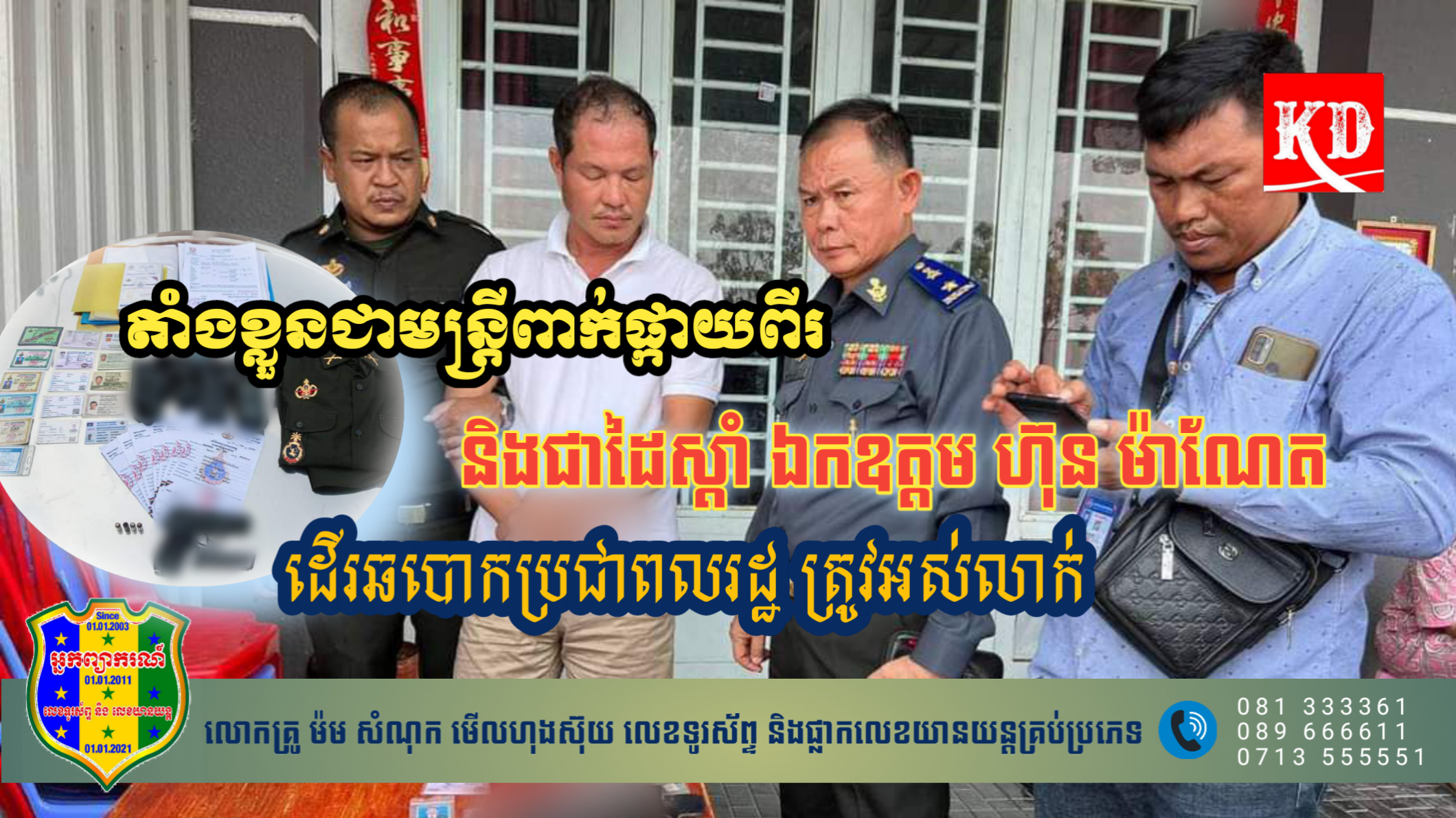 រាជធានីភ្នំពេញ៖ ចាប់បានហើយអ្នកដែលអះអាងថា ខ្លួនពាក់ផ្កាយពីរ និងជាដៃស្តាំឯកឧត្តម នាយឧត្តមសេនីយ៍ ហ៊ុន ម៉ាណែត និងដើរឆបោកប្រជាពលរដ្ឋយកលុយរត់ការចូលក្របខណ្ឌកងទ័ព។