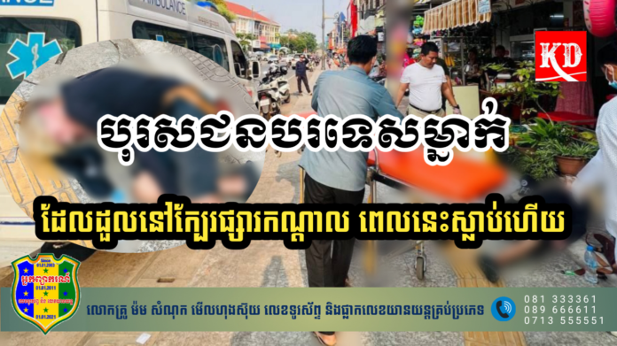 ខេត្តសៀមរាប៖ បុរសជនបរទេស ដែលប្រជាពលរដ្ឋ បានប្រទះឃើញដួលសន្លប់ ក្បែរភ្លើងស្តុបសុីវត្ថា ពេលនេះបានស្លាប់បាត់បង់ជីវិតហើយ។ នេះបើយោងតាមរបាយការណ៍បឋមរបស់សមត្ថកិច្ច ដែលបានឲ្យអង្គភាពសារព័ត៌មាន គូលែនដេលី យើងបានដឹងនៅរសៀលថ្ងៃនេះ។