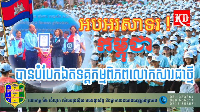 ខេត្តសៀមរាប៖ កម្ពុជាបានបំបែកឯតទគ្គកម្មពិភពលោកសារជាថ្មី «រាំម៉ាឌីហ្សុនច្រើនជាងគេលើពិភពលោក» ដែលមានអ្នកចូលរួមរាំច្រើនជាងគេដោយជោគជ័យជាថ្មីម្ដងទៀត ដោយមានចំនួនអ្នកចូលរួមរាំសរុប ៤៩៩៩ នាក់ ក្នុងព្រឹត្តិការណ៍អង្គរសង្រ្កាន្ដឆ្នាំ២០២៣ នៅទីតាំងព្រះលានជល់ដំរី នាម៉ោង ១០ និង ៣៦នាទីថ្ងៃទី១៥ ខែមេសា ឆ្នាំ២០២៣នេះ ដោយបានបំបែកលើចំនួនឯតទគ្គកម្មដែលកម្ពុជាខ្លួនឯង បានរៀបចំ ក្នុងព្រឹត្តិការណ៍អង្គរសង្ក្រាន្តឆ្នាំ២០១៥ ក្នុងចំនួន២០១៥ នាក់ប៉ុណ្ណោះ។