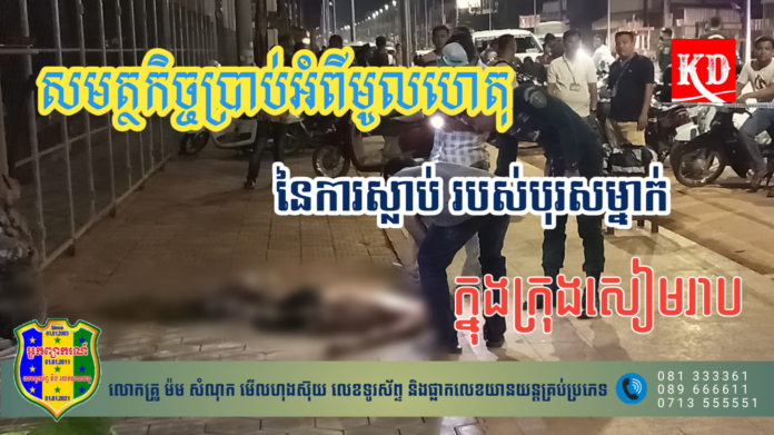 លោក វរសេនីយ៍ឯក បន្តថា ក្រោយទទួលព័ត៌មានខាងលើ កម្លាំងការិយាល័យនគរបាលព្រហ្មទណ្ឌកម្រិតធ្ងន់ សហការណ៏ជាមួយកម្លាំងការិយាល័យនគរបាលបច្ចេកទេស និងវិទ្យាសាស្រ្ត កម្លាំងអធិការដ្ឋាននគរបាលក្រុងសៀមរាប ចុះពិនិត្យជាក់ស្តែងកន្លែងកើតហេតុ ឃើញថាពិតជាមានបុរសម្នាក់បានដេកស្លាប់ពិតប្រាកដមែន។