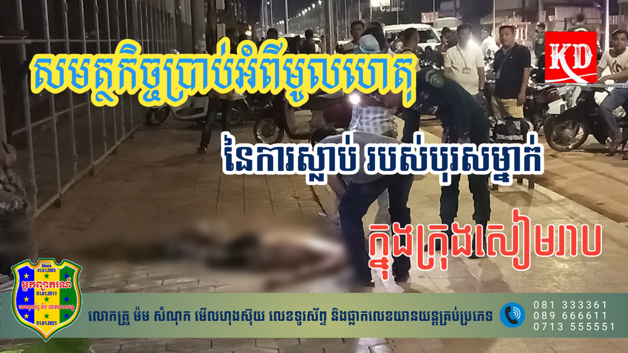 លោក វរសេនីយ៍ឯក សុខ ម៉េងអ៊ាង ឲ្យដឹងថា មានប្រជាពលរដ្ឋរាយការណ៍ អំពីករណីប្រទះឃើញបុរសម្នាក់មិនស្គាល់អត្តសញ្ញាណបានដេកស្លាប់ នៅចំណុចលើចញ្ចើមផ្លូវបេតុង ស្ថិតក្នុងភូមិតាវៀន សង្កាត់សាលាកំរើក ក្រុងសៀមរាប ខេត្តសៀមរាប នៅវេលាម៉ោង ២២ និង ០០នាទី ថ្ងៃទី២៨ ខែមេសា ឆ្នាំ២០២៣។