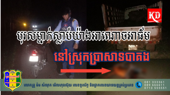 ខេត្តសៀមរាប៖ បុរសម្នាក់ស្លាប់យ៉ាងអាណោចអាធ័ម បន្ទាប់ពីជួបគ្រោះថ្នាក់ចរាចរណ៍ នៅក្នុងភូមិសាស្ត្រស្រុកប្រាសាទបាគង កាលពីវេលាម៉ោង០៣ និង ៤០នាទីទាបភ្លឺ ថ្ងៃទី០១ ខែឧសភា ឆ្នាំ២០២៣។