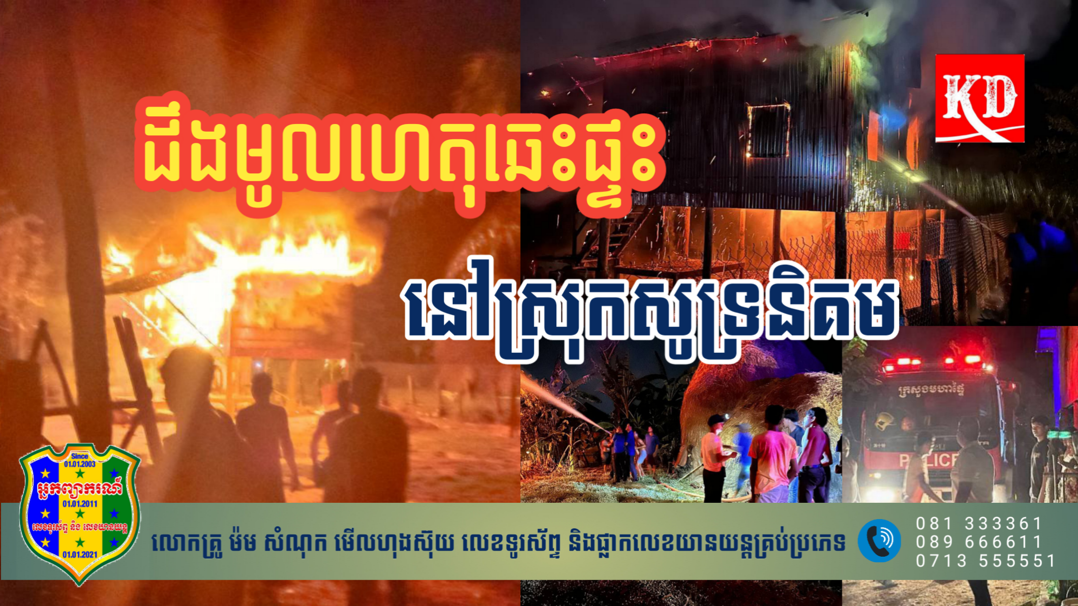 ខេត្តសៀមរាប៖ ផ្ទះឈើមួយខ្នង របស់ប្រជាពលរដ្ឋ នៅក្នុងភូមិគោកមន ឃុំដំដែក ស្រុកសូទ្រនិគម ខេត្តសៀមរាប ត្រូវបានអគ្គិភ័យឆាបឆេះ កាលពីវេលាម៉ោង ២០ និង ២០នាទី ថ្ងៃទី៣០ ខែមេសា ឆ្នាំ២០២៣។