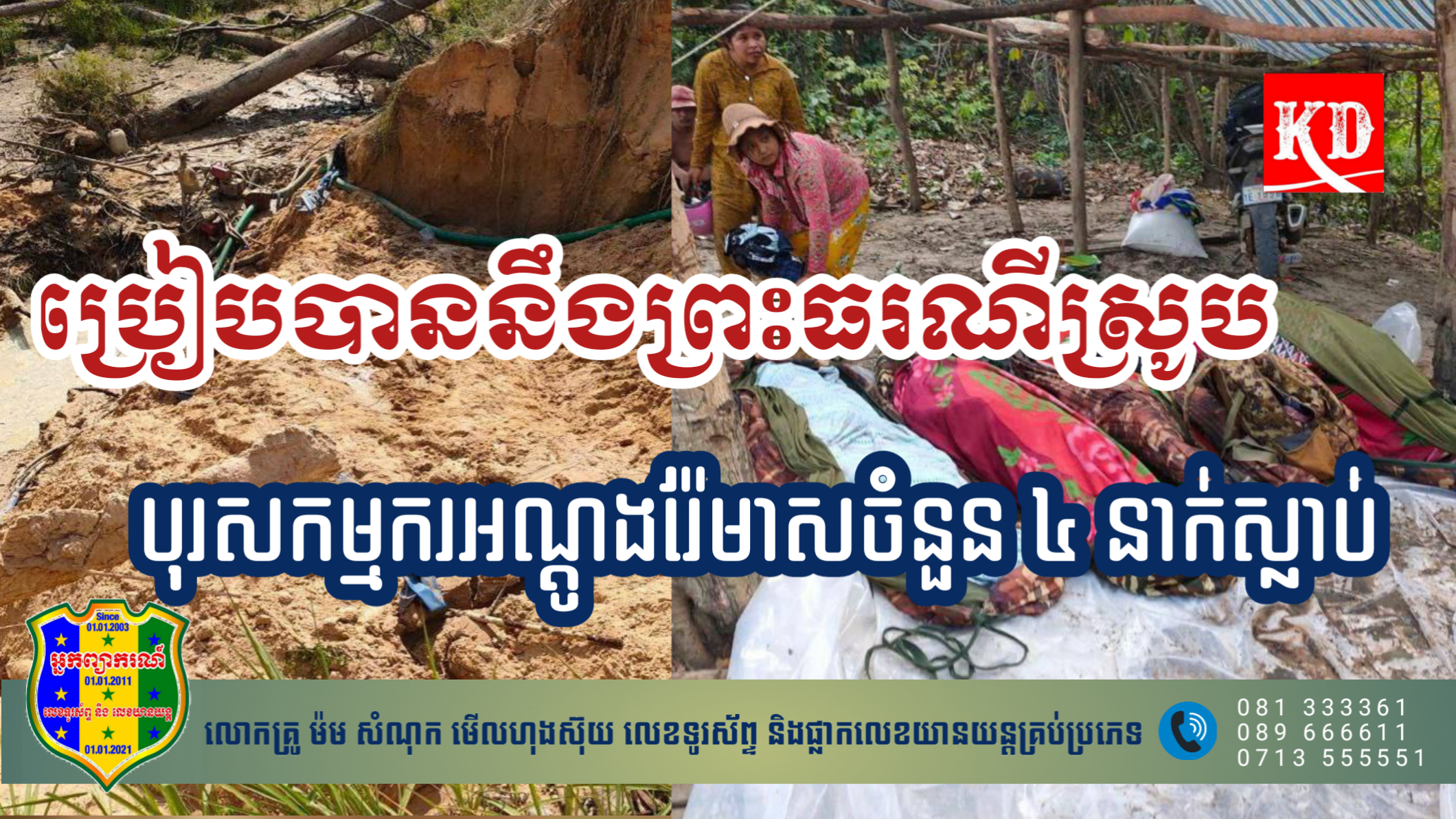 ប្រភពពីសមត្ថកិច្ចបានឱ្យដឹងថា រណ្តៅដីបូមរករ៉ែមាស ដែលគេសង្ស័យថាគ្មានច្បាប់អនុញ្ញាតធ្វើអាជីវកម្មត្រឹមត្រូវនោះ បានបាក់ចូលទៅ ប្រៀបបានហ្នឹងព្រះធរណីស្រូប ហើយឆក់យកជីវិតមនុស្សប្រុស ដែលជាកម្មករនៅទីនោះចំនួន ៤ នាក់យ៉ាងអាណោចអាធ័មជាទីបំផុត។