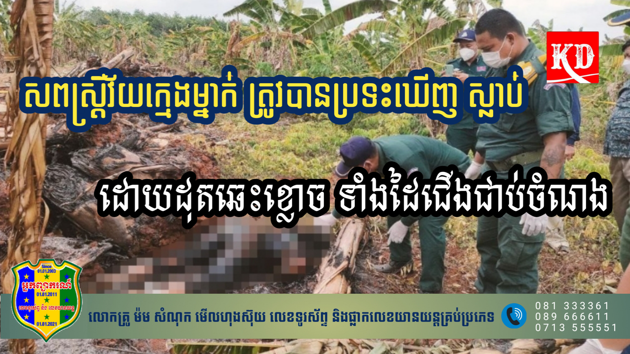 សមត្ថកិច្ចថា មុនពេលប្រទះឃើញសាកសពដំបូងមានកម្មករស៊ីឈ្នួលម្នាក់បានបើកថាឡេថង ដើម្បីទៅកាប់ចេកនៅក្នុងចំការ ដែលជារបស់ថៅកែ ឈ្មោះ ហេង វិសា ដើម្បីប្រមូលឲ្យបានច្រើនយកទៅលក់នៅលើទីផ្សារ។ ពេលដែលកំពុងតែដើរកាត់ក្នុងចម្ការចេកក៏ស្រាប់តែប្រទះឃើញសាកសពមនុស្សស្ត្រី មិនស្គាល់អត្តសញ្ញាណម្នាក់ ដែលសង្ស័យថា ត្រូវបានក្រុមឃាតករដែលមិនស្គាល់អត្តសញ្ញាណ អាចមានគ្នាយ៉ាងតិចពីរនាក់ឡើង យកមកចងជើងនិង រុំស្កុតដៃរួចដុតរោលឡើងខ្លោច ក្នុងស្ថានភាពដេកផ្កាប់មុខ ដែលគួរឱ្យខ្លោចផ្សាជាទីបំផុត។